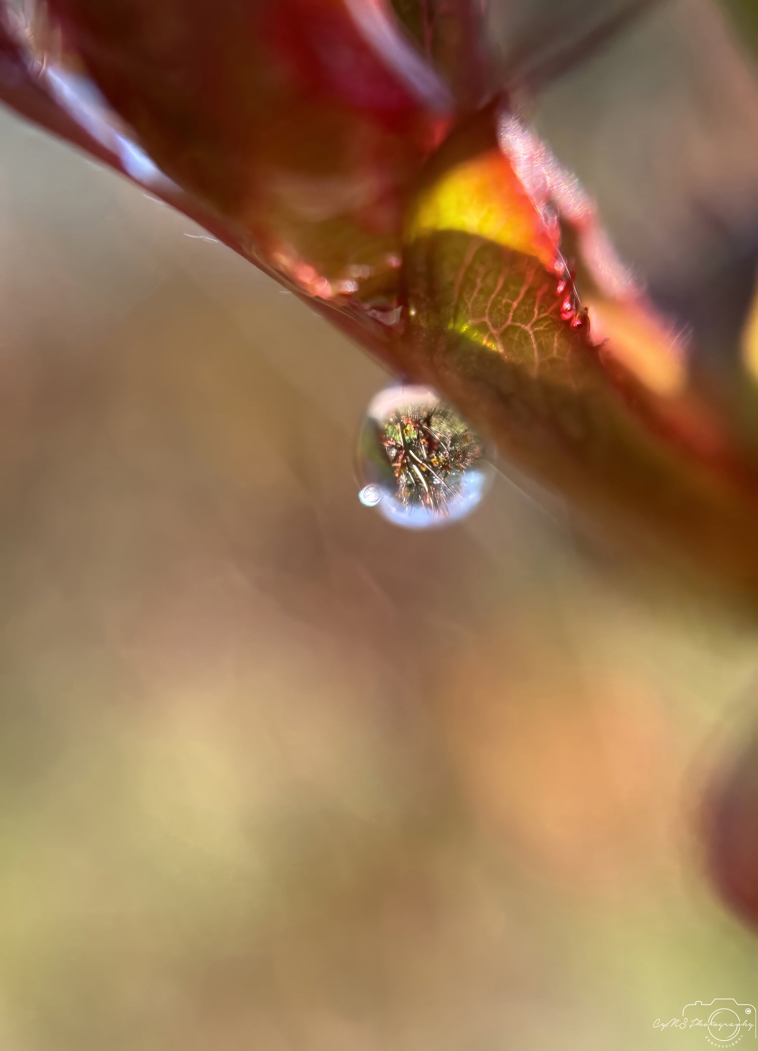 In this close-up of a beautiful water droplet, the reflection within the droplet reveals the vivid reddish and dark orange colors of a Rosa sempervirens. The contrast between the bright colors of the reflection and the droplet’s surface creates a stunning and vibrant visual, showcasing the delicate beauty of the flower.