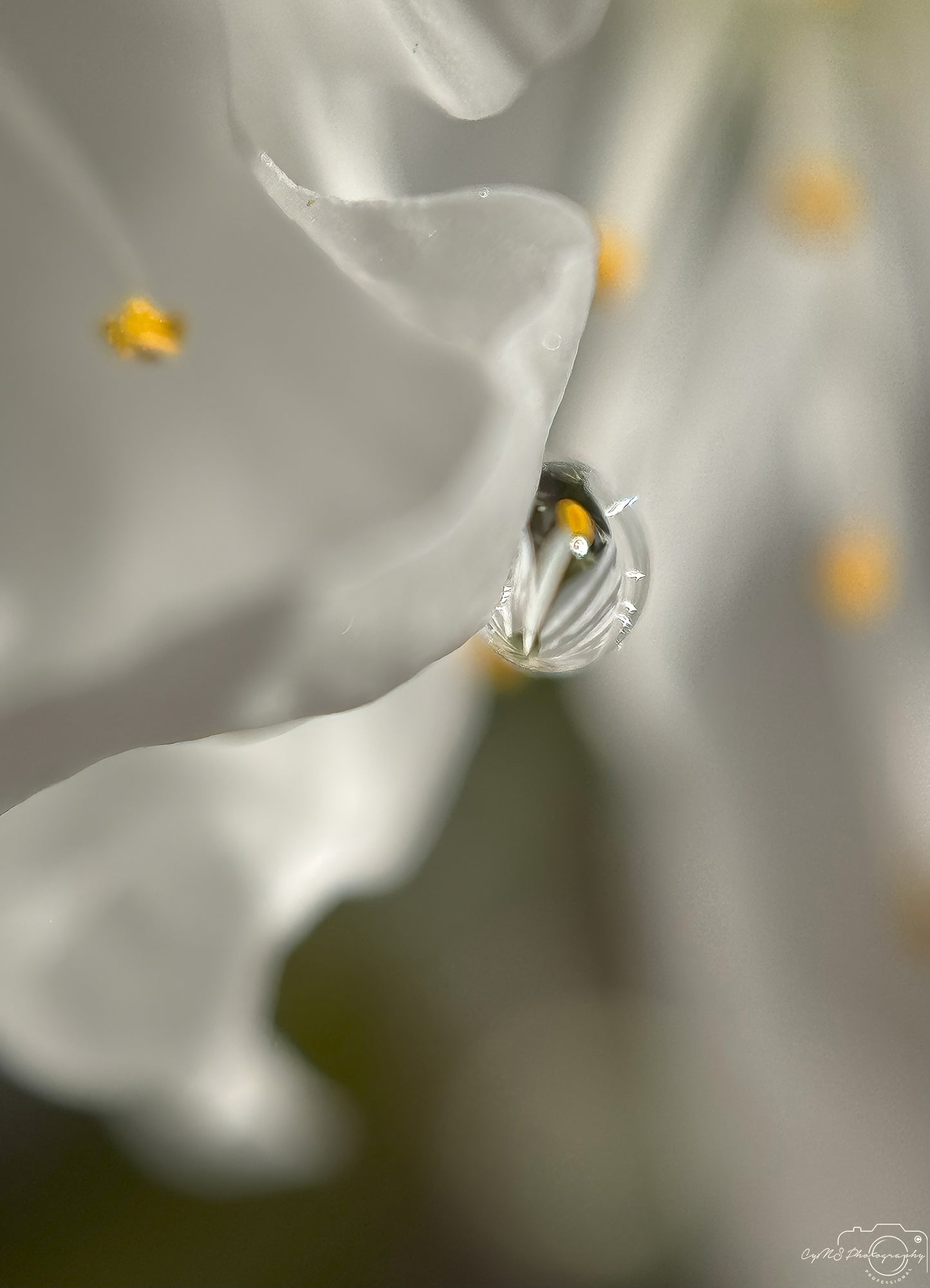 In this new scene, a beautiful water drop lies gently on the immaculate white flower of a Prunus avium, its pristine surface catching the light and reflecting the soft surroundings with delicate precision, while the pure white petals beneath enhance the drop’s clarity, creating a serene and elegant moment suspended in nature’s quiet beauty.