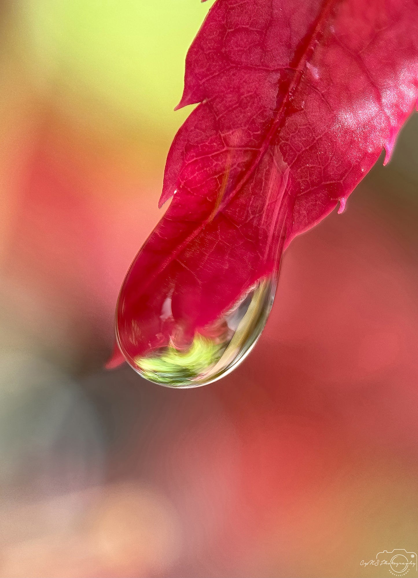 A single water drop rests on the leaf of an Acer palmatum. Perfectly clear, it reflects the vibrant reddish hues of the leaf and the world around it. The drop sits quietly, capturing the beauty of its surroundings in delicate stillness, as the vibrant colors of the leaf ripple and dance in its reflection.