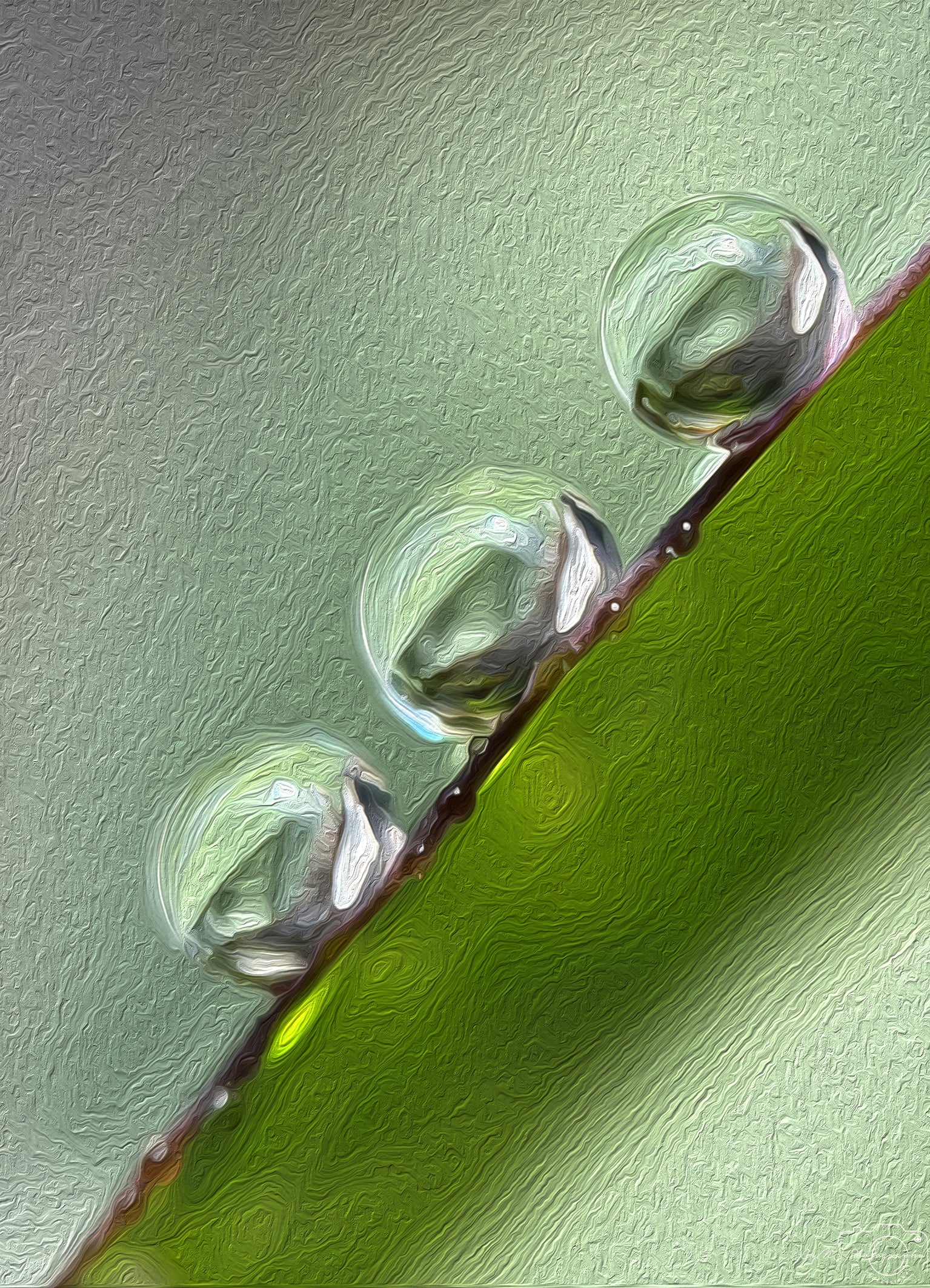 Along a slender twig, many droplets lie side by side, each one catching the light in its own way. The colors around them are vivid—greens and soft browns blending in a vibrant harmony. The droplets, perfectly round, reflect the scene like tiny glass beads, turning a simple twig into something quietly beautiful.