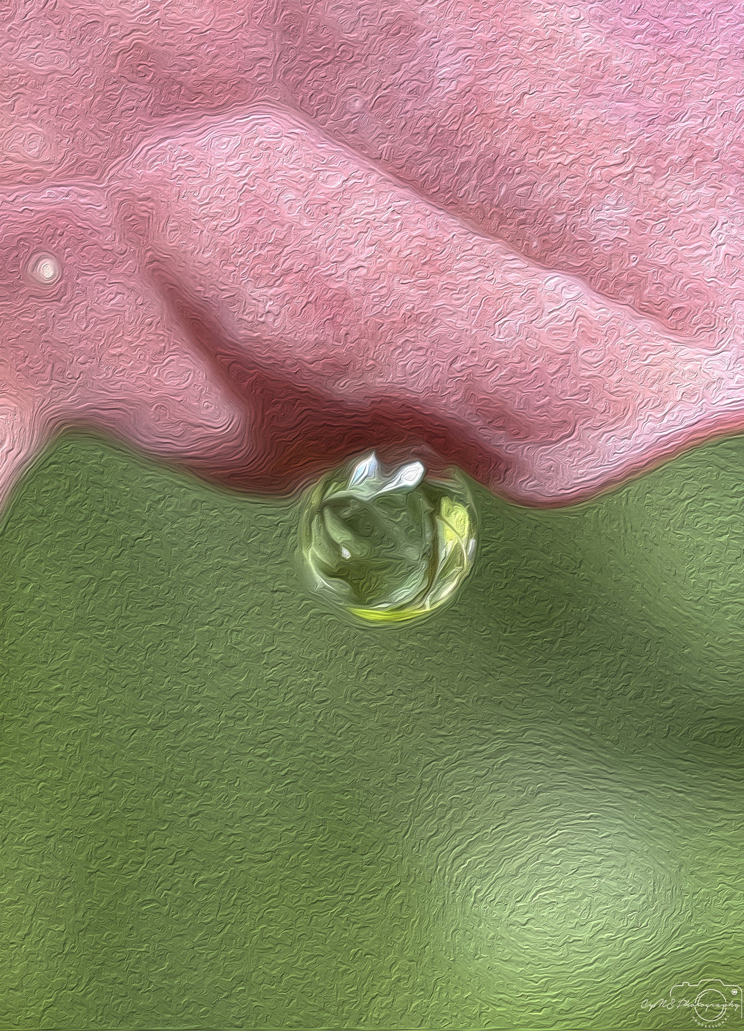 On an almost dead leaf of an Atriplex hortensis, with vivid pink fading, rests a beautiful water drop. The droplet reflects the surrounding vivid green, creating a striking contrast with the leaf's decaying color. It captures the fleeting beauty of nature, where even in decline, there’s a moment of life.