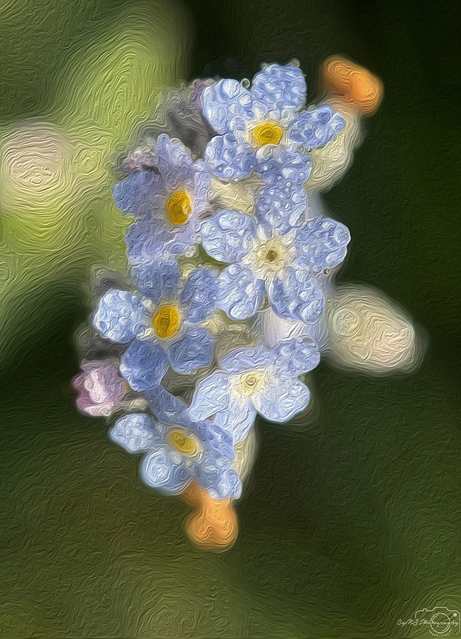 Many tiny dew droplets rest gently on the delicate petals of Myosotis arvensis, capturing the morning light like scattered gems in the sun’s gentle embrace. Each glistening sphere reflects a miniature world of stillness and clarity.