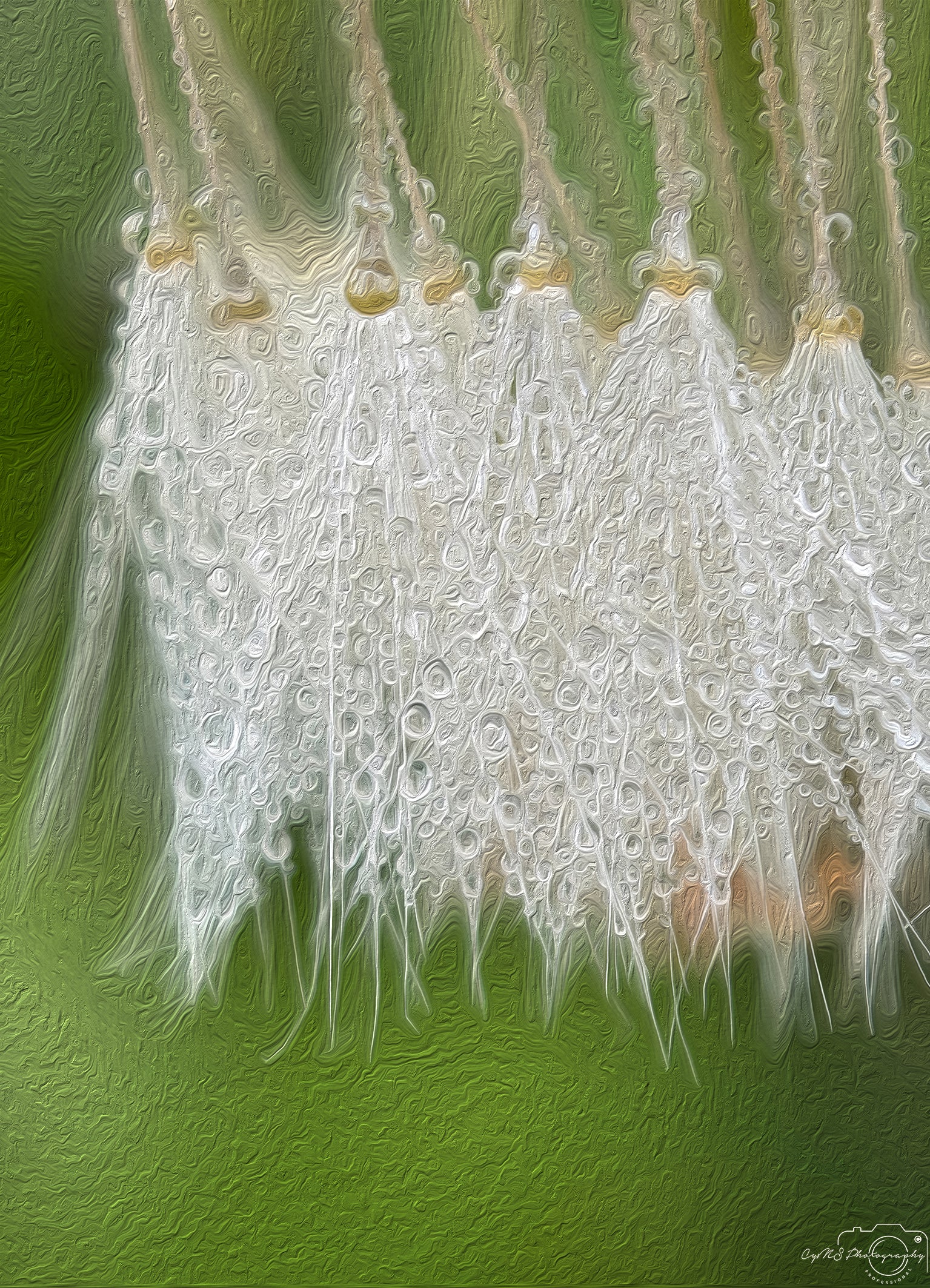 Many tiny dew droplets cling delicately to the fine filaments of a dandelion, captured in a beautiful macro that reveals a world of hidden elegance. Each droplet glimmers like a crystal, reflecting light with quiet brilliance. The intricate structure of the dandelion holds them like a crown of morning jewels.