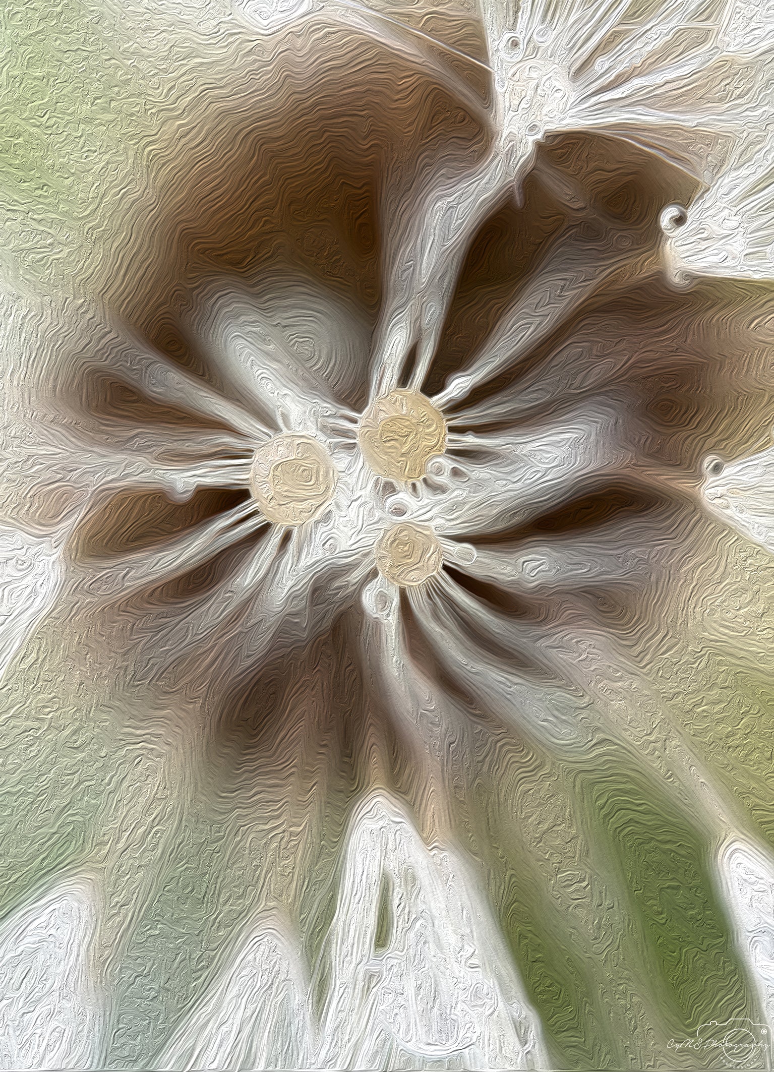 Three tiny dew droplets cling delicately at the center of a dandelion, captured in a beautiful macro that reveals a world of hidden elegance. Each droplet glimmers like a crystal, reflecting light with quiet brilliance. The intricate structure of the dandelion holds them like a crown of morning jewels.