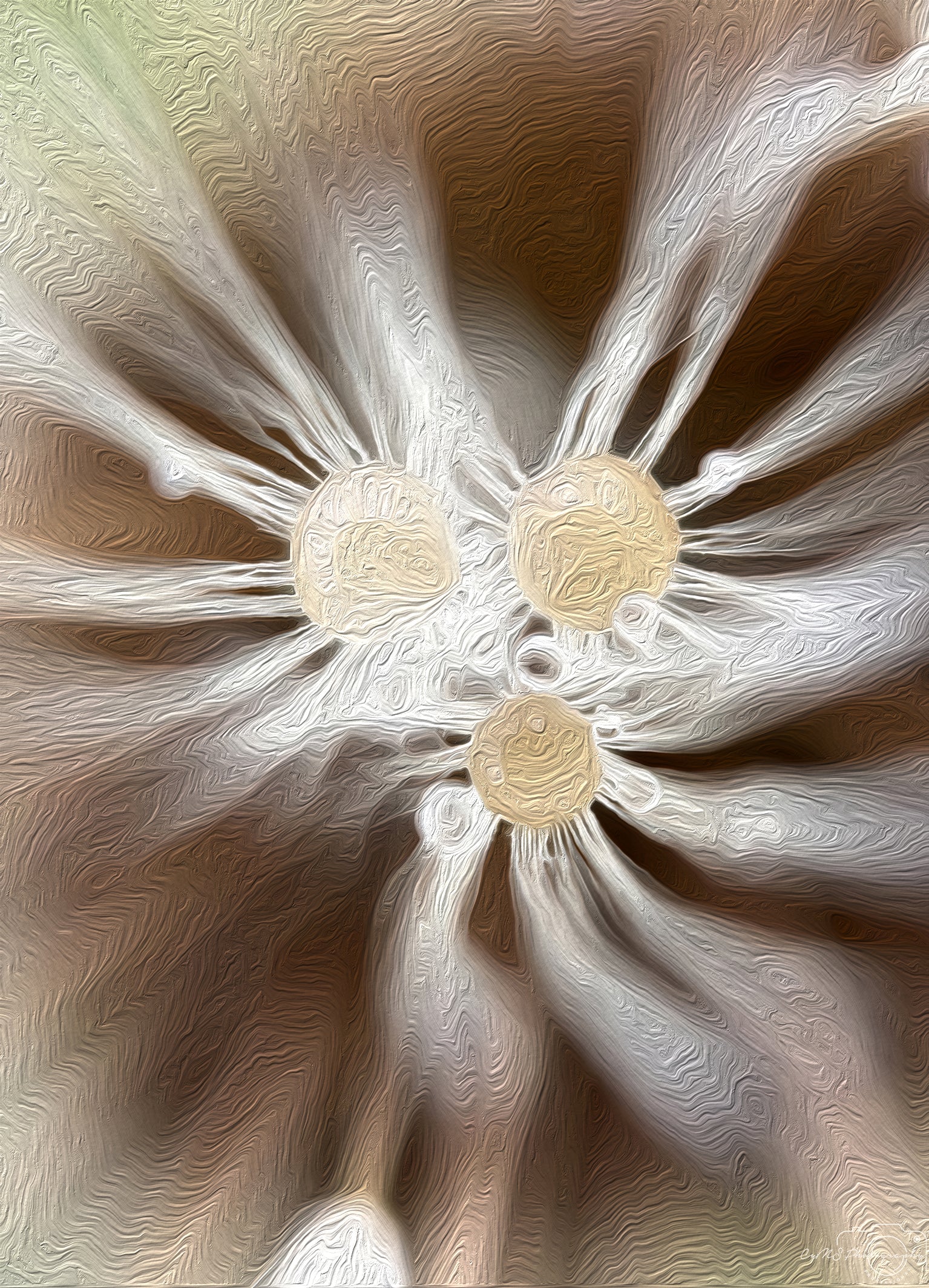Three tiny dew droplets cling delicately at the center of a dandelion, captured in a beautiful macro that reveals a world of hidden elegance. Each droplet glimmers like a crystal, reflecting light with quiet brilliance. The intricate structure of the dandelion holds them like a crown of morning jewels.