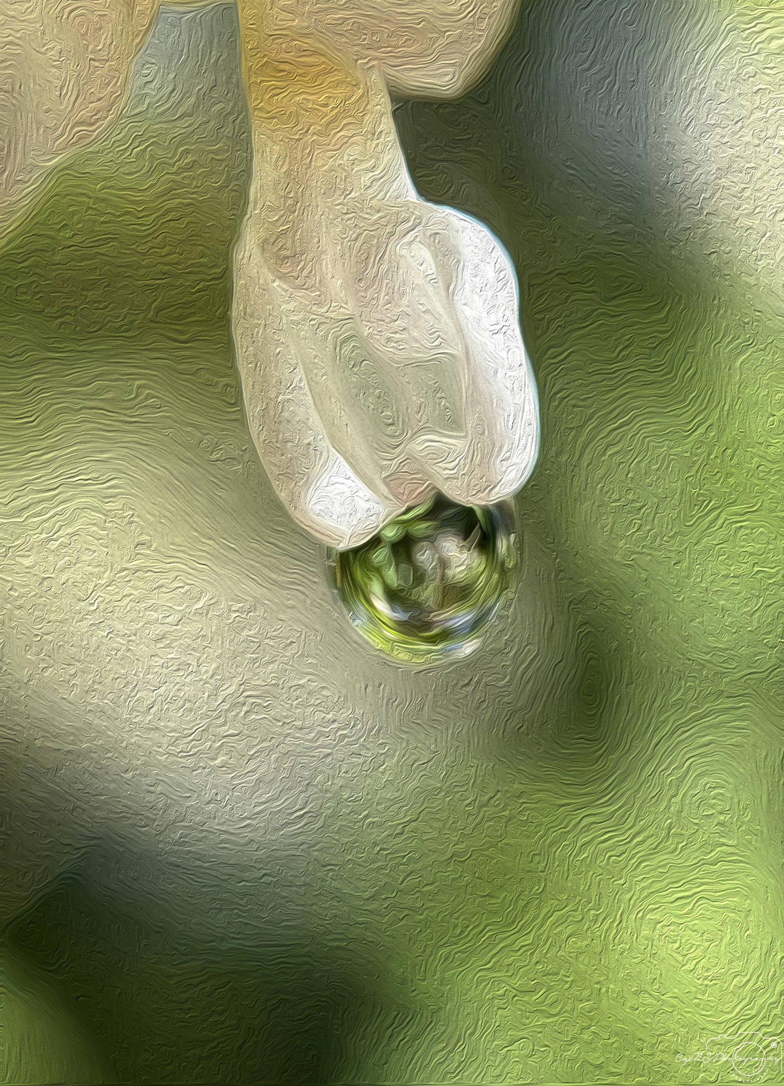 A single droplet lies gently on the bright white flower of a Phaseolus vulgaris, its delicate form shimmering like a tiny crystal against the soft petals. The contrast between the purity of the flower and the drop’s glistening presence creates a moment of quiet beauty.