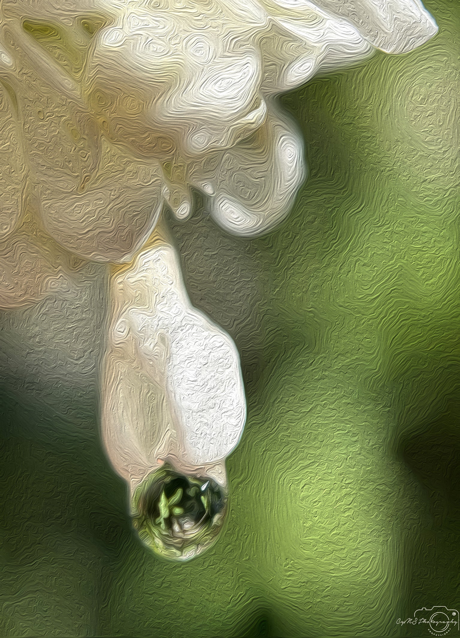 A single droplet lies gently on the bright white flower of a Phaseolus vulgaris, its delicate form shimmering like a tiny crystal against the soft petals. The contrast between the purity of the flower and the drop’s glistening presence creates a moment of quiet beauty.