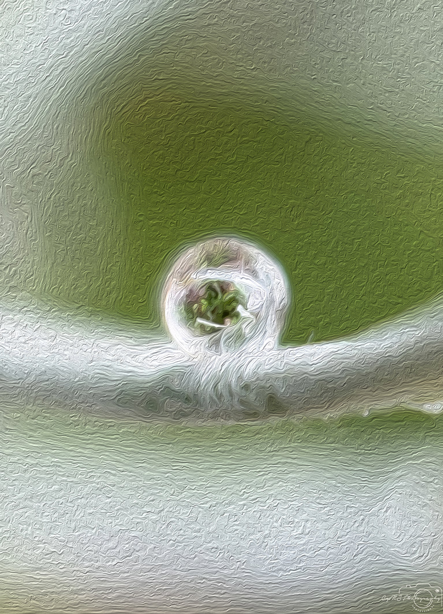 A single water droplet lies gently on a Helichrysum italicum, its smooth surface reflecting the surrounding colors in a delicate play of light. The vibrant green leaves and deep burgundy tones of the plant frame the droplet, enhancing its natural beauty and creating a harmonious blend of nature's colors. The droplet, like a tiny mirror, captures the essence of its environment, adding a subtle yet captivating detail to the scene.