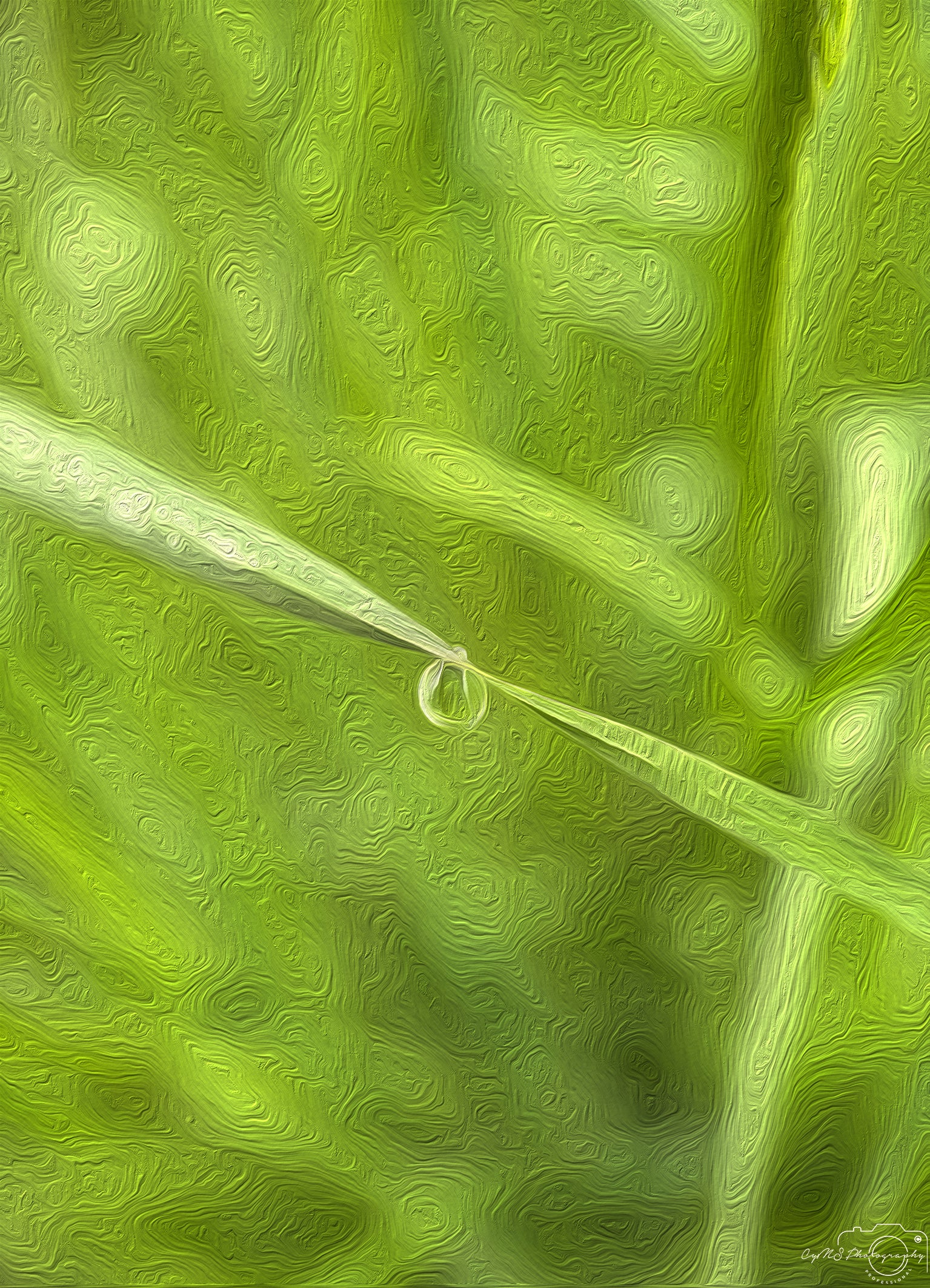 A single dew drop balances exactly in between two slender blades of grass, its presence delicate yet striking. The vivid green of the surrounding foliage sets the perfect stage, making the droplet gleam like a tiny lens of light—a quiet marvel in the heart of morning stillness.