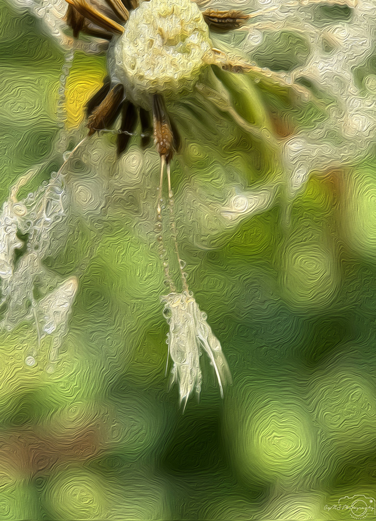 Many tiny dew droplets cling delicately to the fine filaments of a dandelion, captured in a beautiful macro that reveals a world of hidden elegance. Each droplet glimmers like a crystal, reflecting light with quiet brilliance. The intricate structure of the dandelion holds them like a crown of morning jewels.