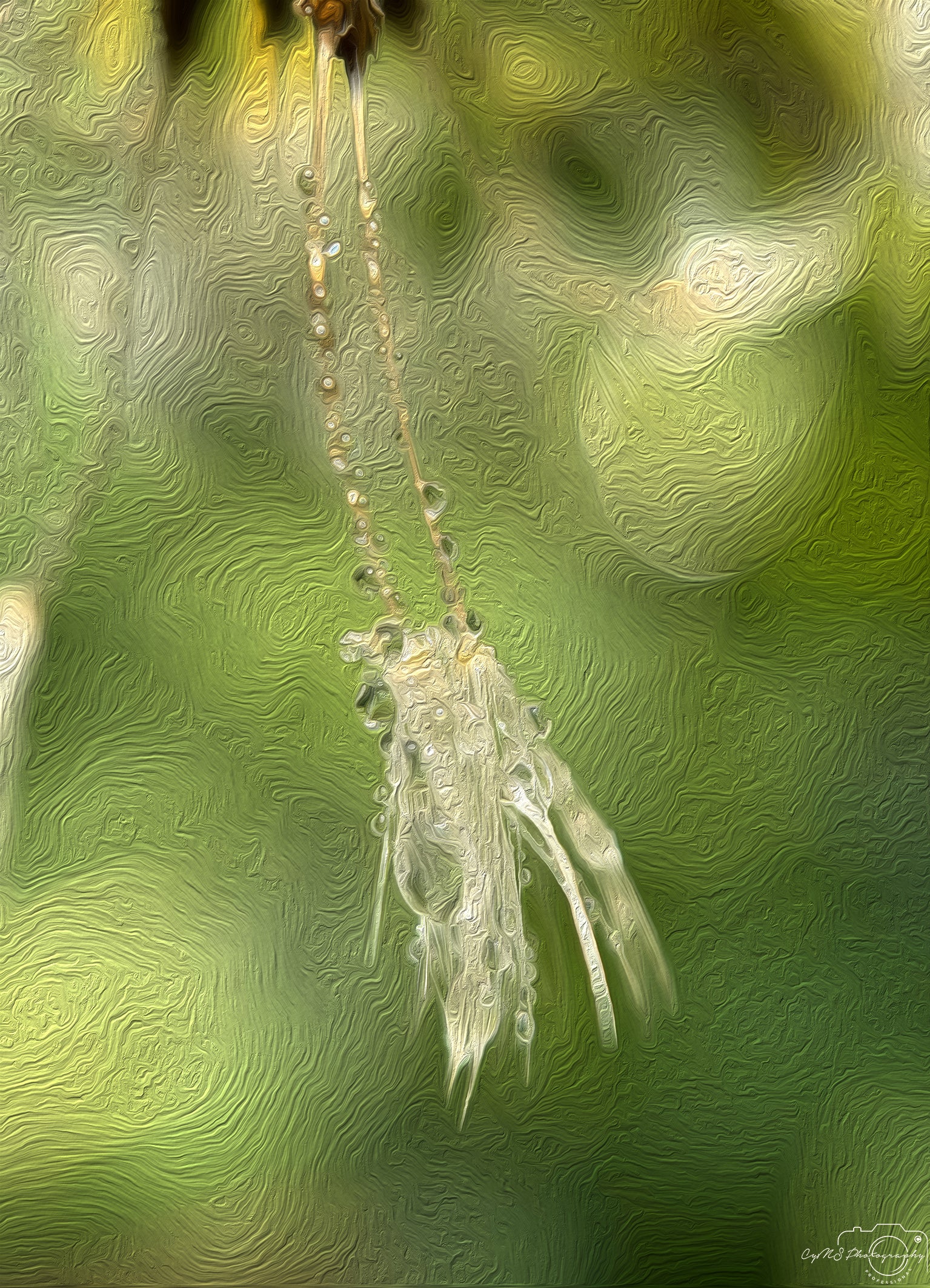 Many tiny dew droplets cling delicately to the fine filaments of a dandelion, captured in a beautiful macro that reveals a world of hidden elegance. Each droplet glimmers like a crystal, reflecting light with quiet brilliance. The intricate structure of the dandelion holds them like a crown of morning jewels.