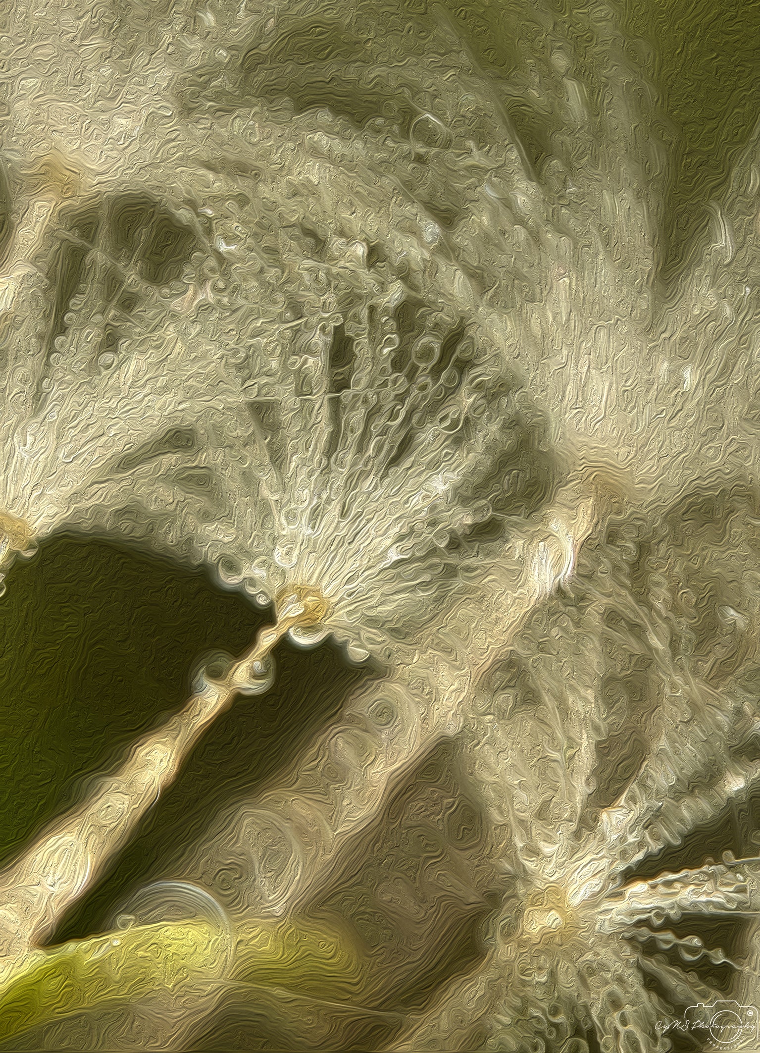 Many tiny dew droplets cling delicately to the fine filaments of a dandelion, captured in a beautiful macro that reveals a world of hidden elegance. Each droplet glimmers like a crystal, reflecting light with quiet brilliance. The intricate structure of the dandelion holds them like a crown of morning jewels.