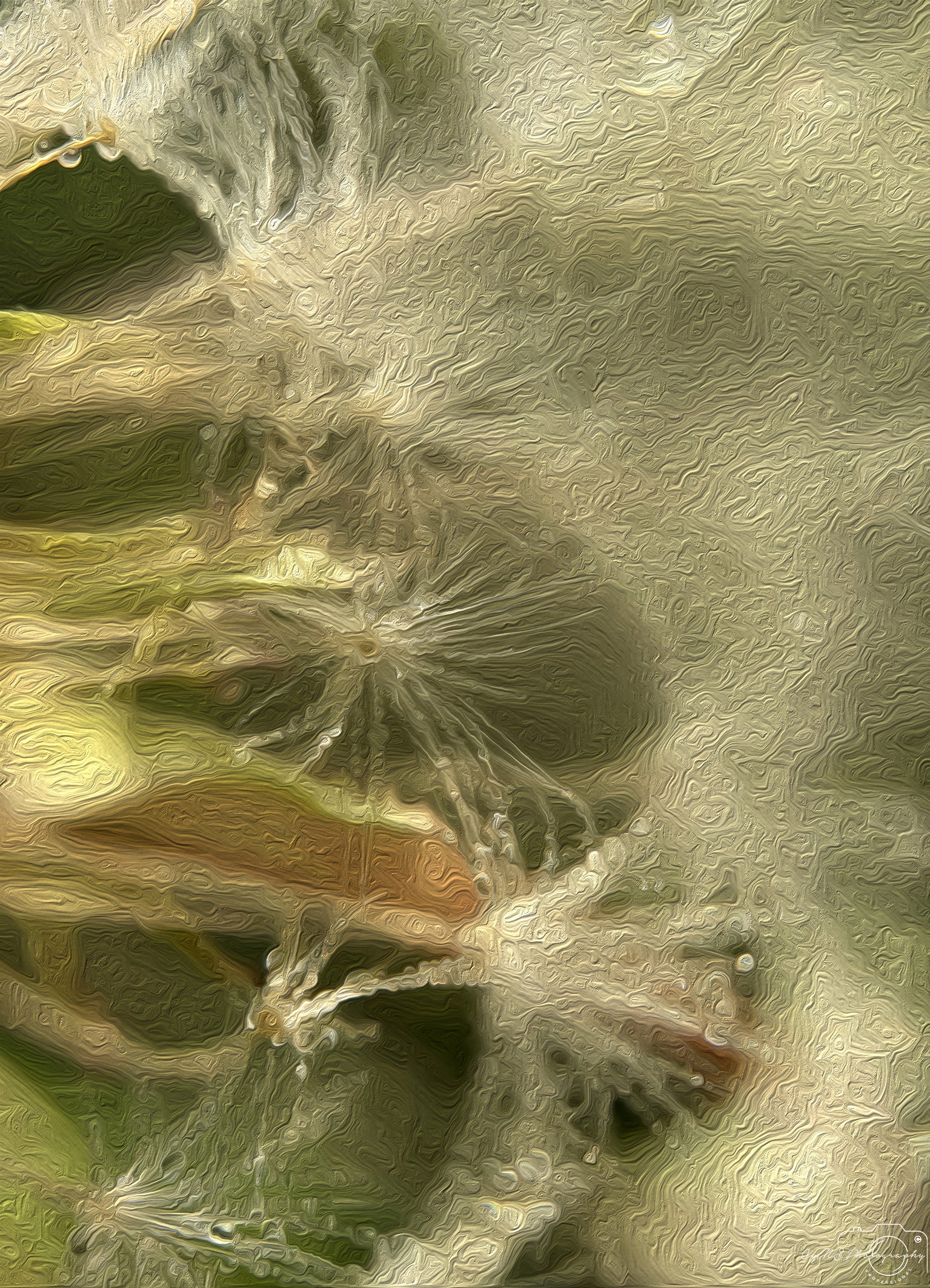 Many tiny dew droplets cling delicately to the fine filaments of a dandelion, captured in a beautiful macro that reveals a world of hidden elegance. Each droplet glimmers like a crystal, reflecting light with quiet brilliance. The intricate structure of the dandelion holds them like a crown of morning jewels.