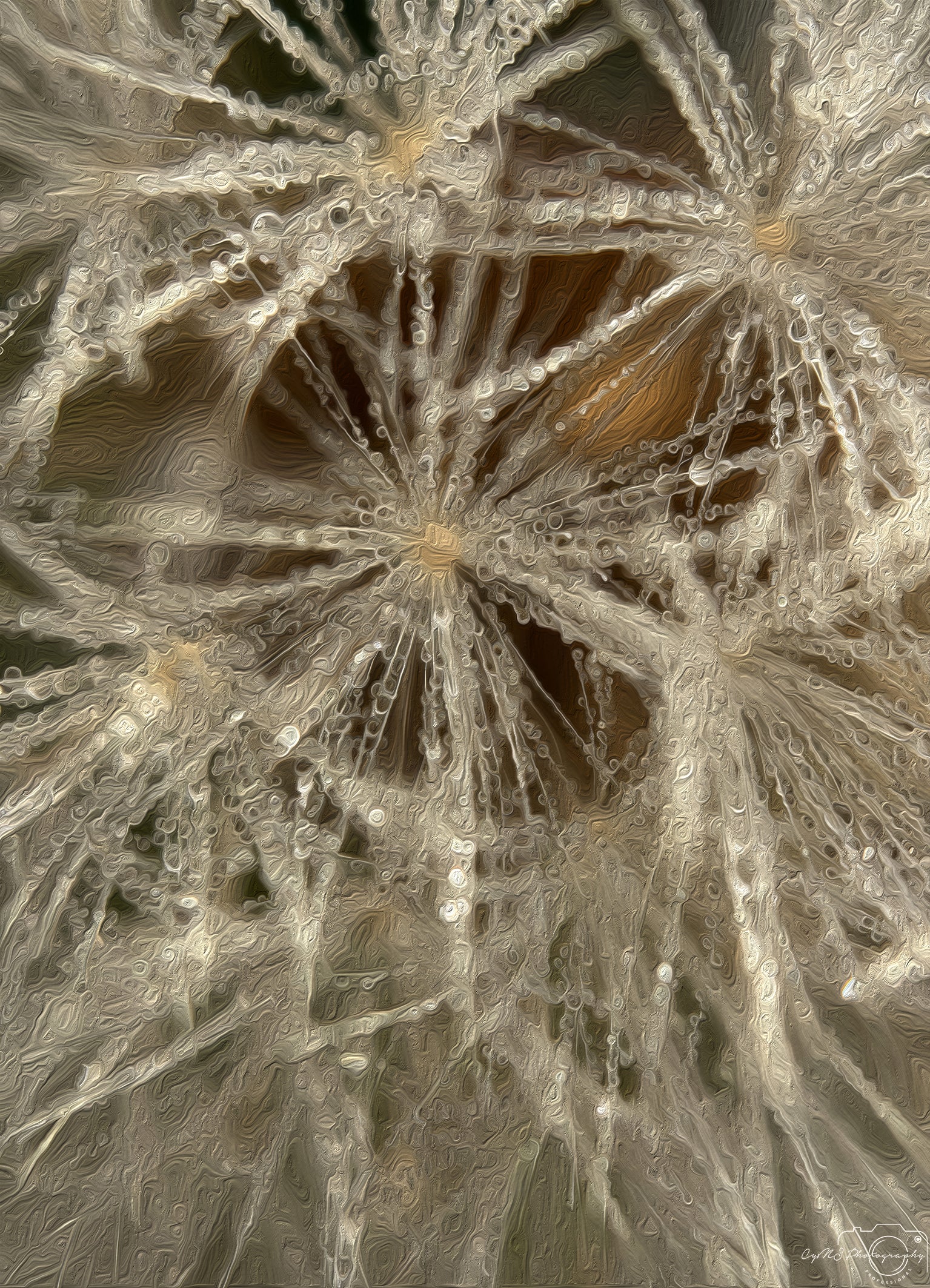 Many tiny dew droplets cling delicately to the fine filaments of a dandelion, captured in a beautiful macro that reveals a world of hidden elegance. Each droplet glimmers like a crystal, reflecting light with quiet brilliance. The intricate structure of the dandelion holds them like a crown of morning jewels.