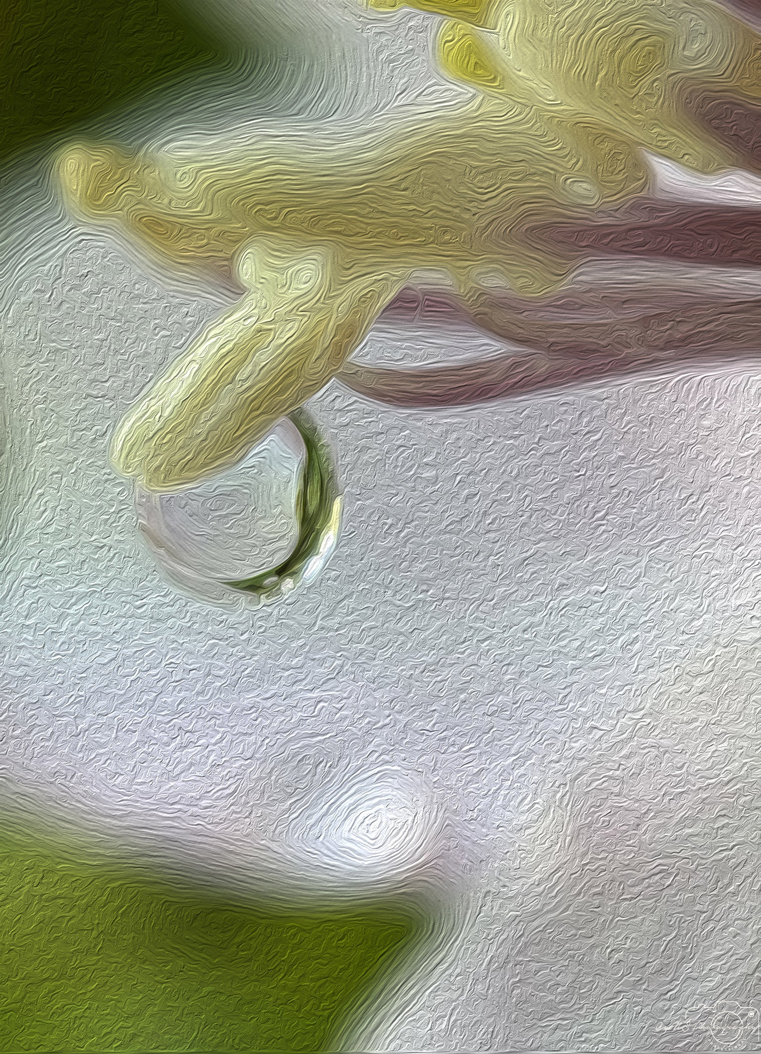On a Crataegus laevigata, a magnificent water drop lies gracefully upon the flower. The petals, a brilliant white, surround the drop, while the pistils, an intense pink, provide a striking contrast. The drop, reflecting the delicate hues, seems to capture the essence of the bloom, magnifying its beauty in a moment of quiet stillness.