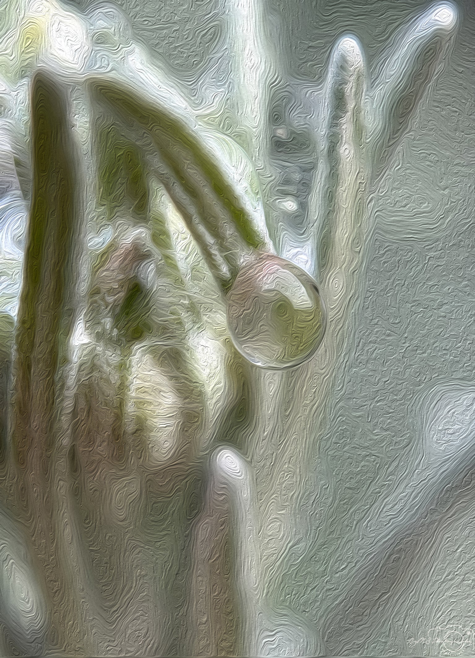A dew water drop lies gently on a Helichrysum italicum leaf, its smooth surface reflecting the soft light of the morning. The fine hairs on the leaf’s edges catch the droplets, enhancing the delicate beauty of the plant. The drop rests quietly, a tiny gem amidst the silvery green foliage, capturing the essence of the early day.