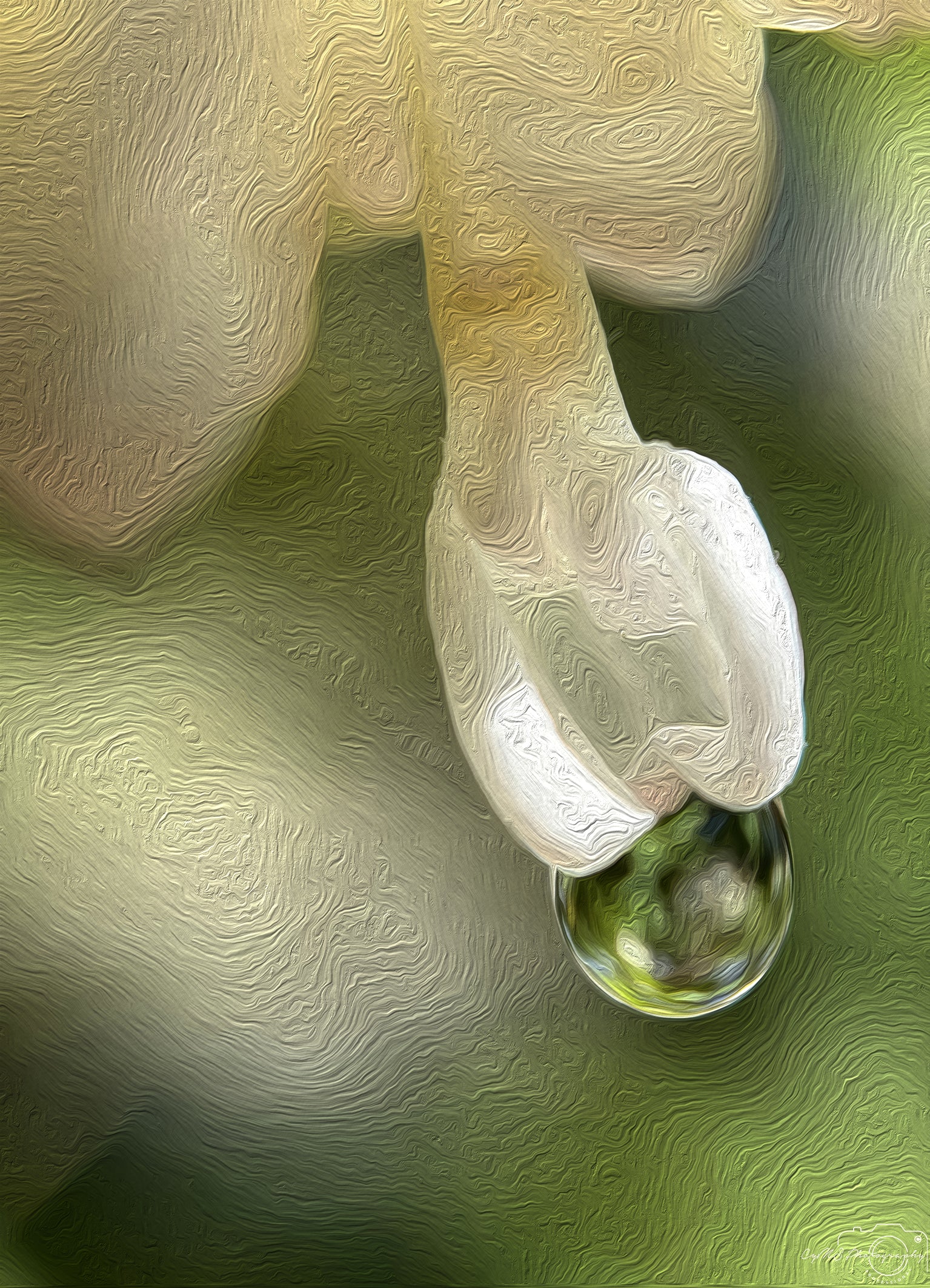 A single droplet lies gently on the bright white flower of a Phaseolus vulgaris, its delicate form shimmering like a tiny crystal against the soft petals. The contrast between the purity of the flower and the drop’s glistening presence creates a moment of quiet beauty.