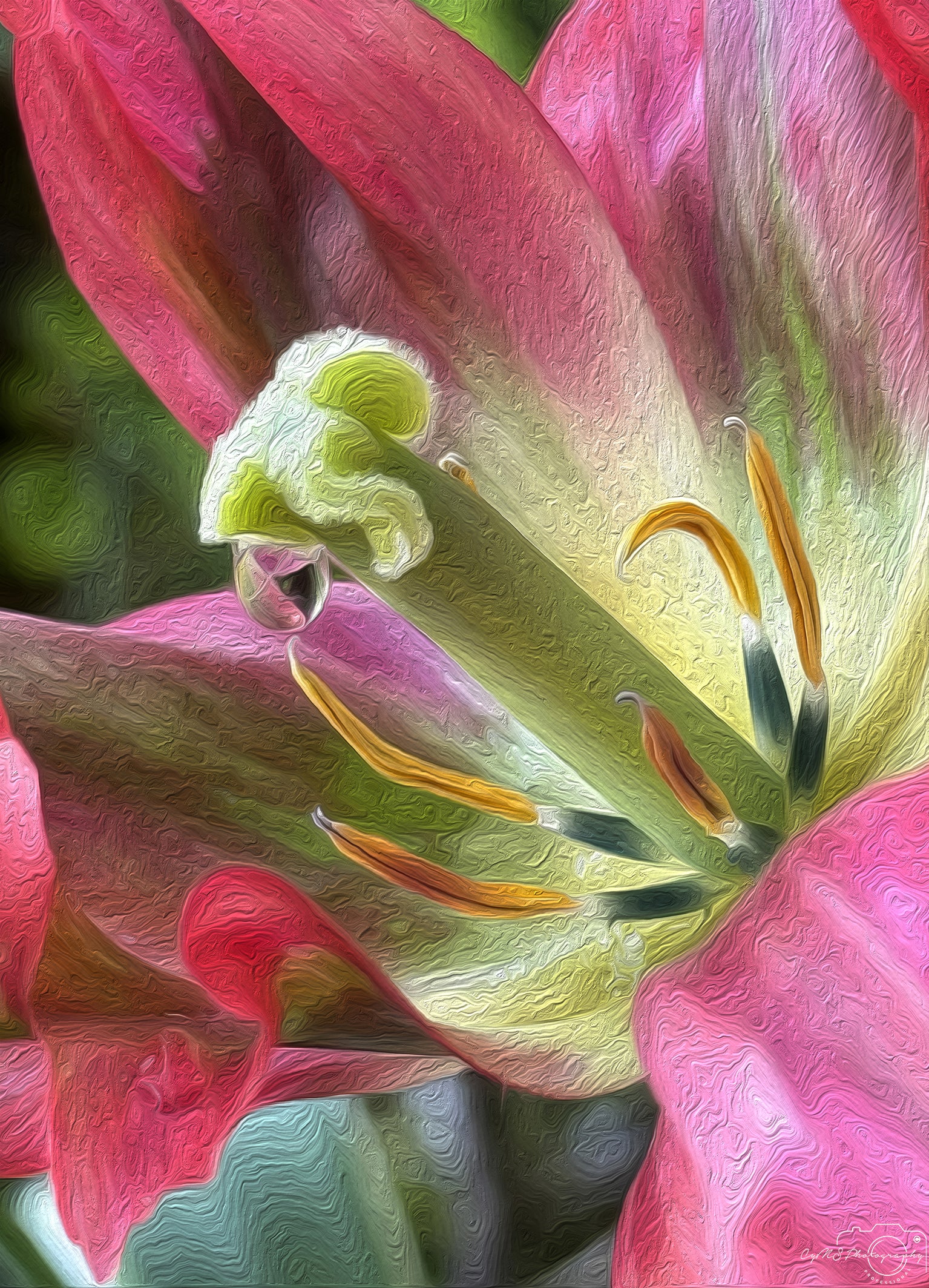 At the center of a Tulipa agenensis, where the nectar pools in secret stillness, a beautiful water drop rests like a jewel. Within it unfolds a festival of colors—light green, yellow, red, pink, and deep green—blending in a mesmerizing dance, as if the drop were a living reflection of the flower’s vibrant soul. Nestled deep within the bloom, the drop takes on the delicate shape of a spaceship—its curved form and luminous surface giving it an otherworldly presence, as though nature had hidden a vessel from the stars in the flower’s core.
