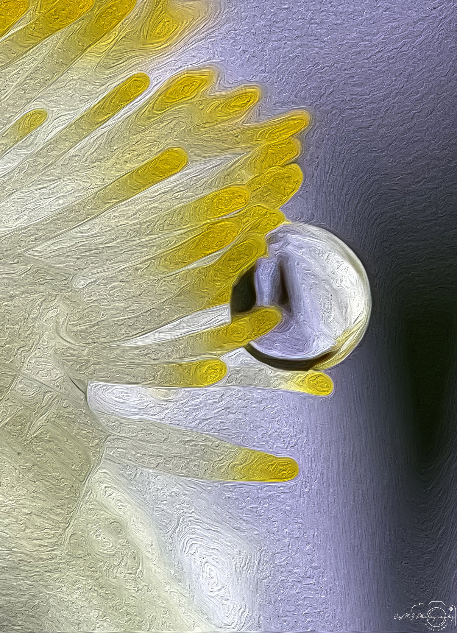 On an Iris pallida, nestled between its elegant pistils, lies a magnificent and translucent water drop. It reflects a blend of magnificent colors—yellow, light purple, and white—capturing the delicate hues of the flower in its clear, shimmering surface. Inside the drop, the reflection forms a playful shape, almost like a "smiley" or emoji, as if nature itself is winking at the viewer with quiet joy.