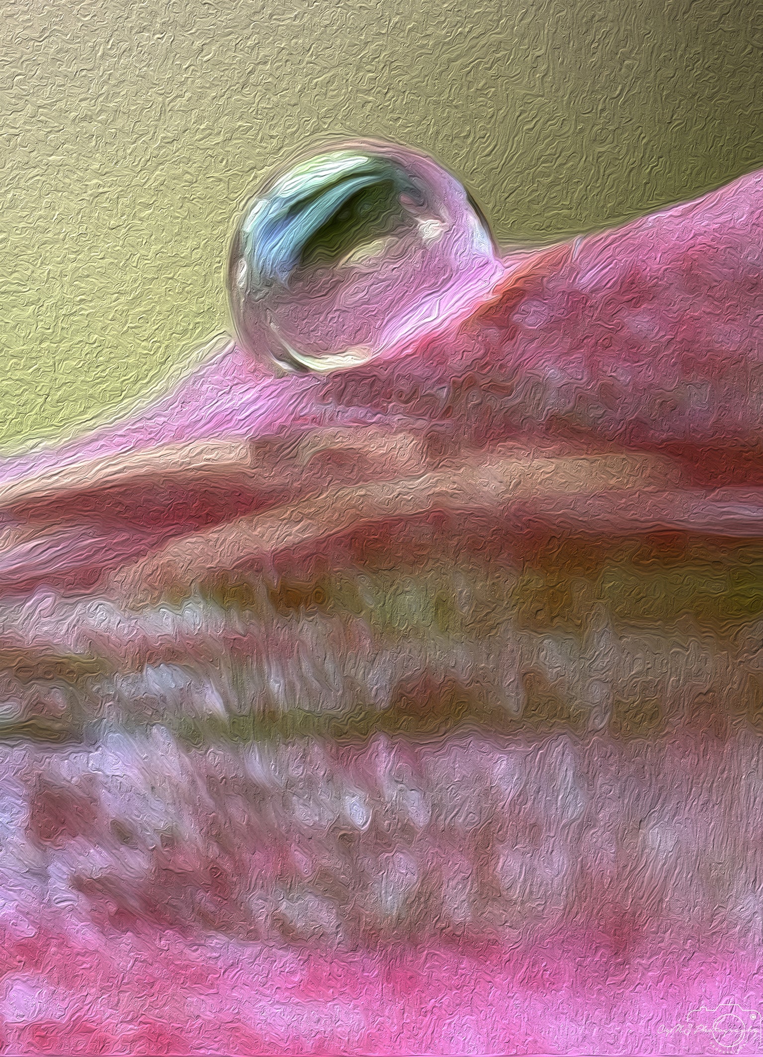 On a Tulipa agenensis, a beautiful and perfectly rounded water drop rests gently on one of its vibrant petals. The colors within the drop—swirling pinks, and light browns—blend together in a mesmerizing dance, as if the drop itself is a tiny, living reflection of the flower’s vivid heart, capturing its essence in a fleeting moment of beauty.