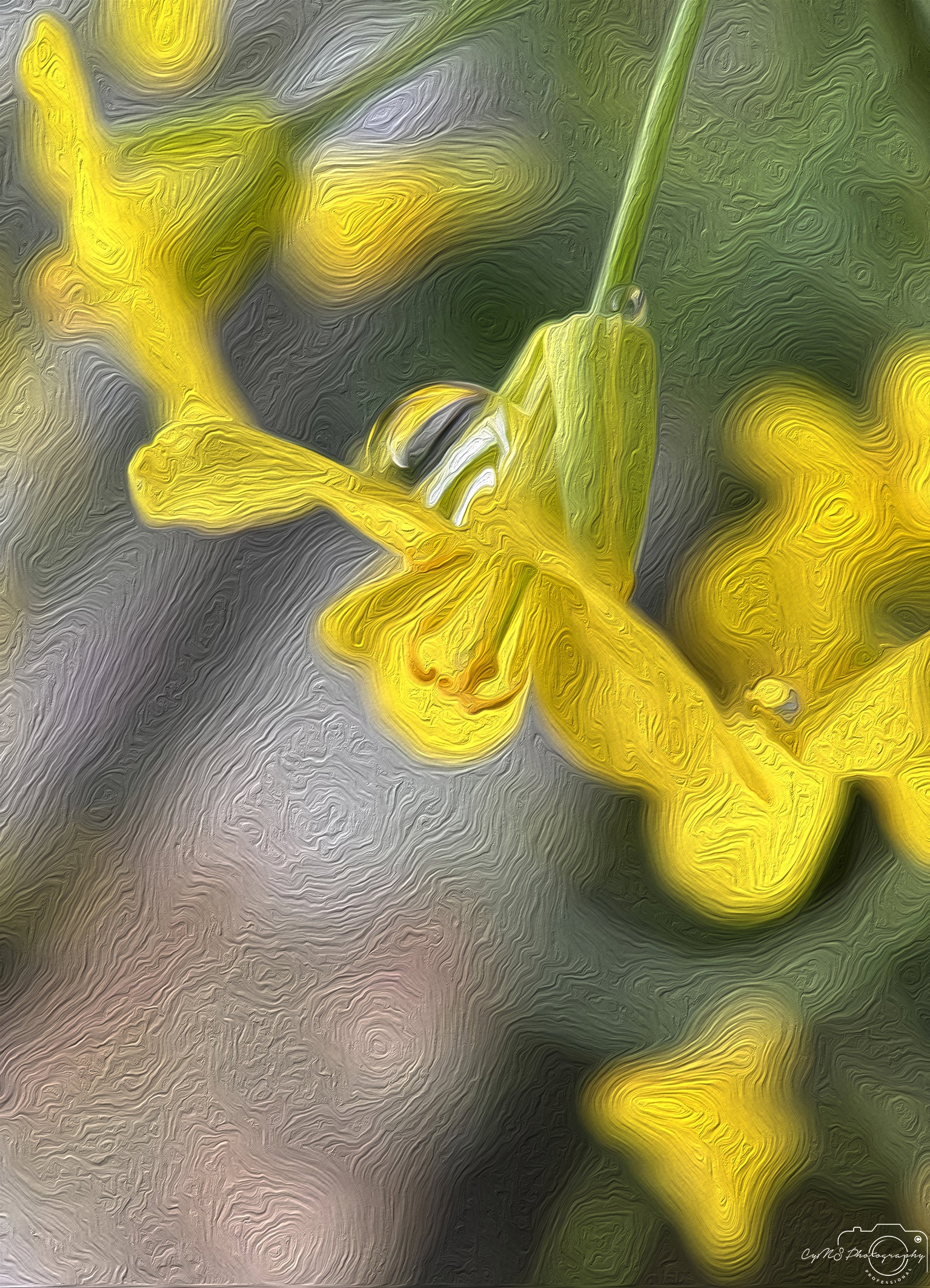 On a Brassica napus, a beautiful water drop rests delicately, its surface reflecting the vibrant green of the plant’s leaves and the bright yellow of the tiny flowers around it. The drop captures the rich hues in a perfect mirror, as if holding the essence of the plant’s life and energy within its fragile form.