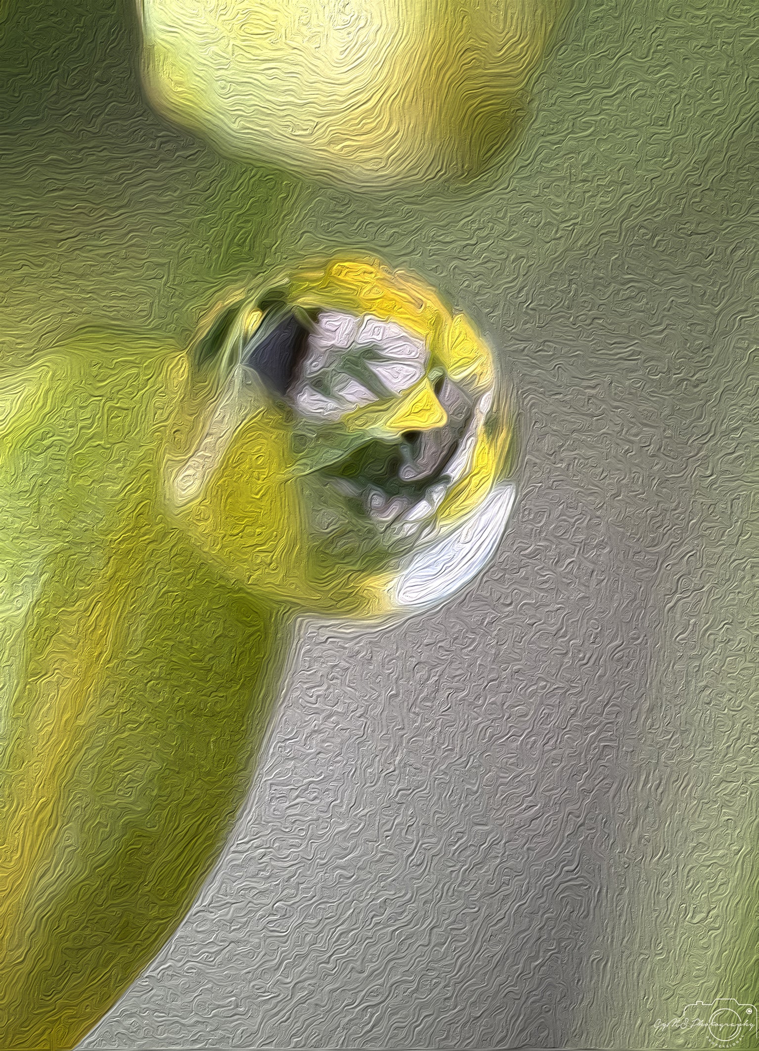On a Brassica napus, a beautiful water drop rests delicately, its surface reflecting the vibrant green of the plant’s leaves and the bright yellow of the tiny flowers around it. The drop captures the rich hues in a perfect mirror, as if holding the essence of the plant’s life and energy within its fragile form.