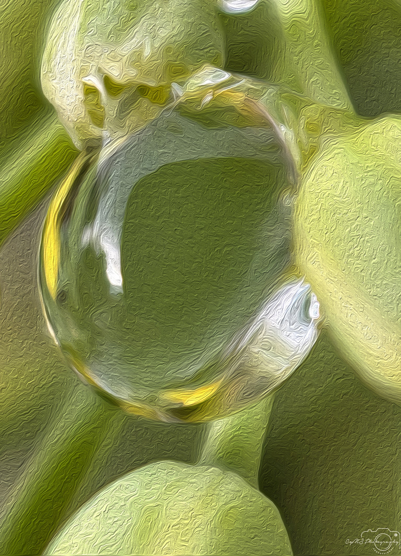 On a Brassica napus, a beautiful water drop rests delicately, its surface reflecting the vibrant green of the plant’s leaves and the bright yellow of the tiny flowers around it. The drop captures the rich hues in a perfect mirror, as if holding the essence of the plant’s life and energy within its fragile form.