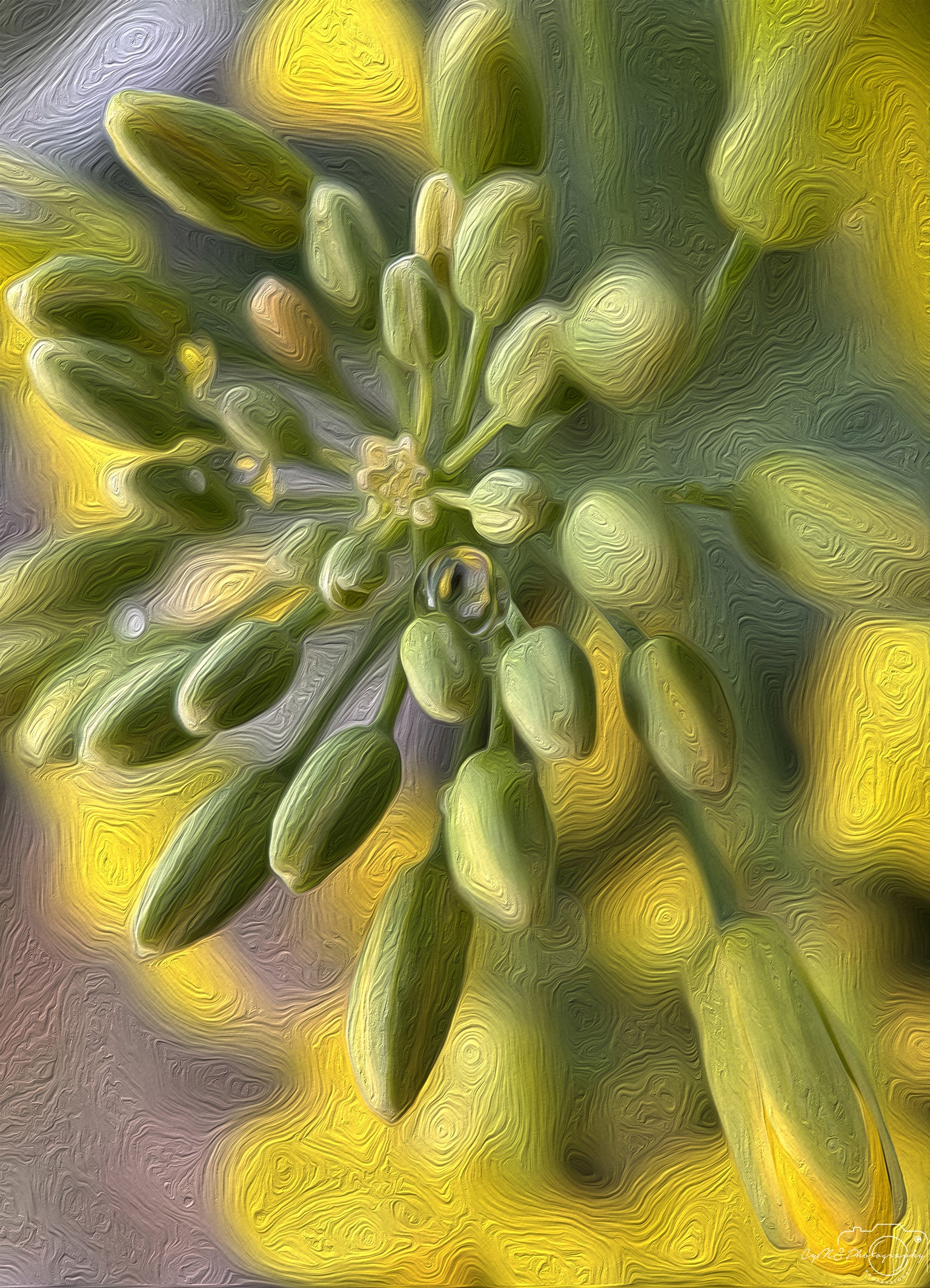On a Brassica napus, a beautiful water drop rests delicately, its surface reflecting the vibrant green of the plant’s leaves and the bright yellow of the tiny flowers around it. The drop captures the rich hues in a perfect mirror, as if holding the essence of the plant’s life and energy within its fragile form.