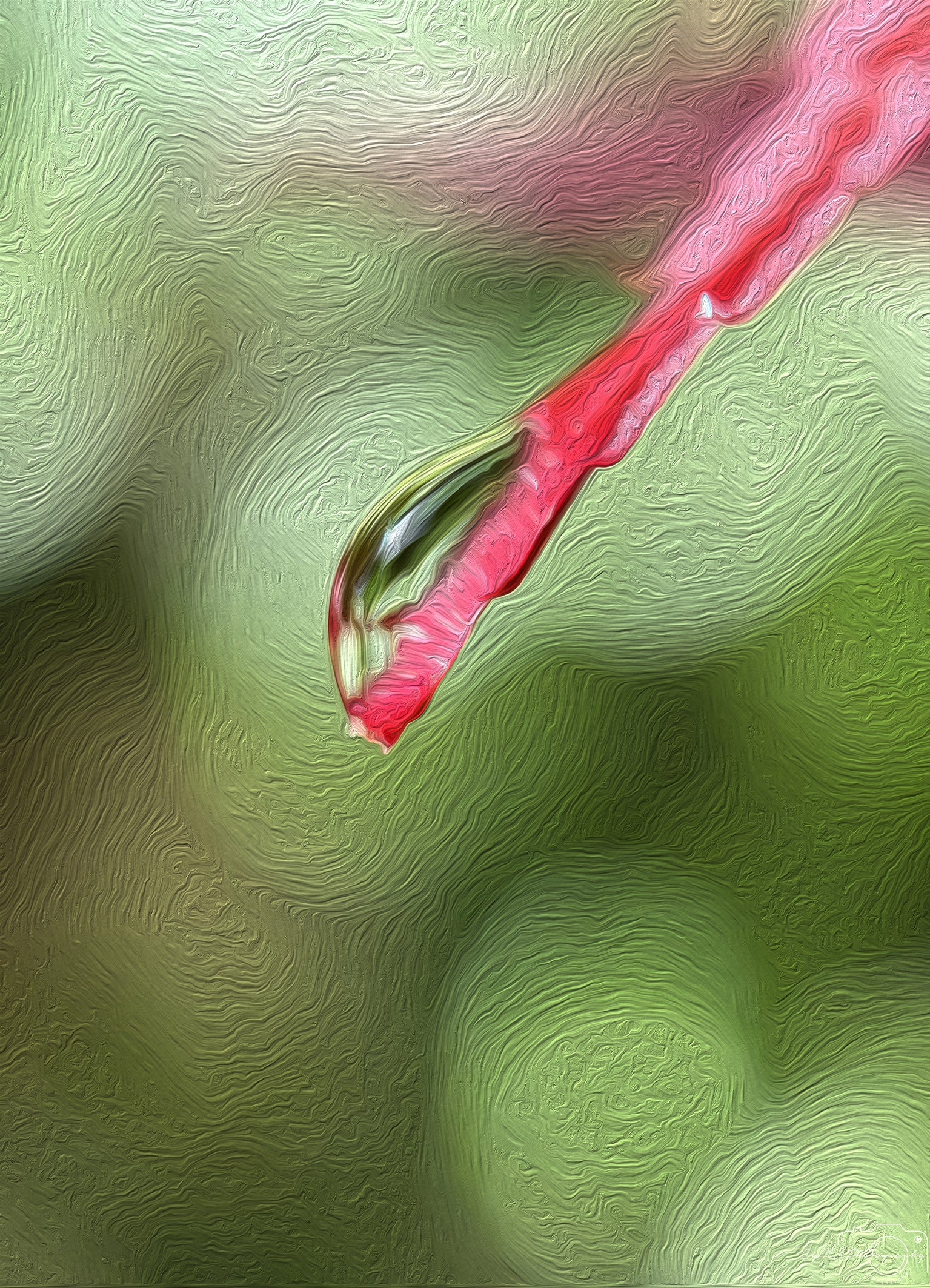 On an Acer palmatum, at the tip of a tattered yet bright and beautiful red leaf, a stunning water drop rests, perfectly shaped like a tiny spaceship. Its smooth, reflective surface mirrors the jagged edges of the leaf beneath, and for a moment, it seems as if it’s poised to take flight, carrying the quiet wonder of the natural world into the unknown.