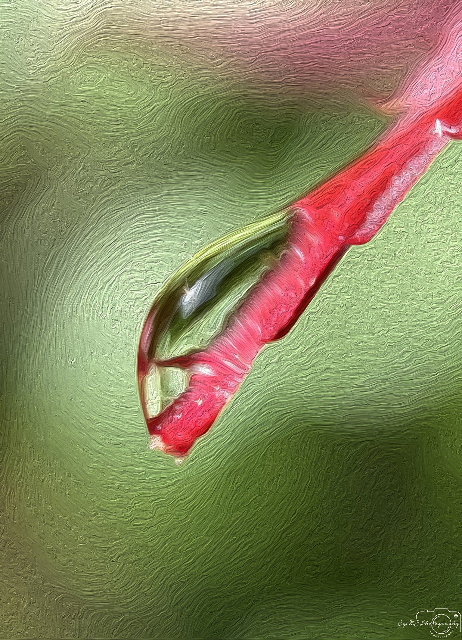 On an Acer palmatum, at the tip of a tattered yet bright and beautiful red leaf, a stunning water drop rests, perfectly shaped like a tiny spaceship. Its smooth, reflective surface mirrors the jagged edges of the leaf beneath, and for a moment, it seems as if it’s poised to take flight, carrying the quiet wonder of the natural world into the unknown.