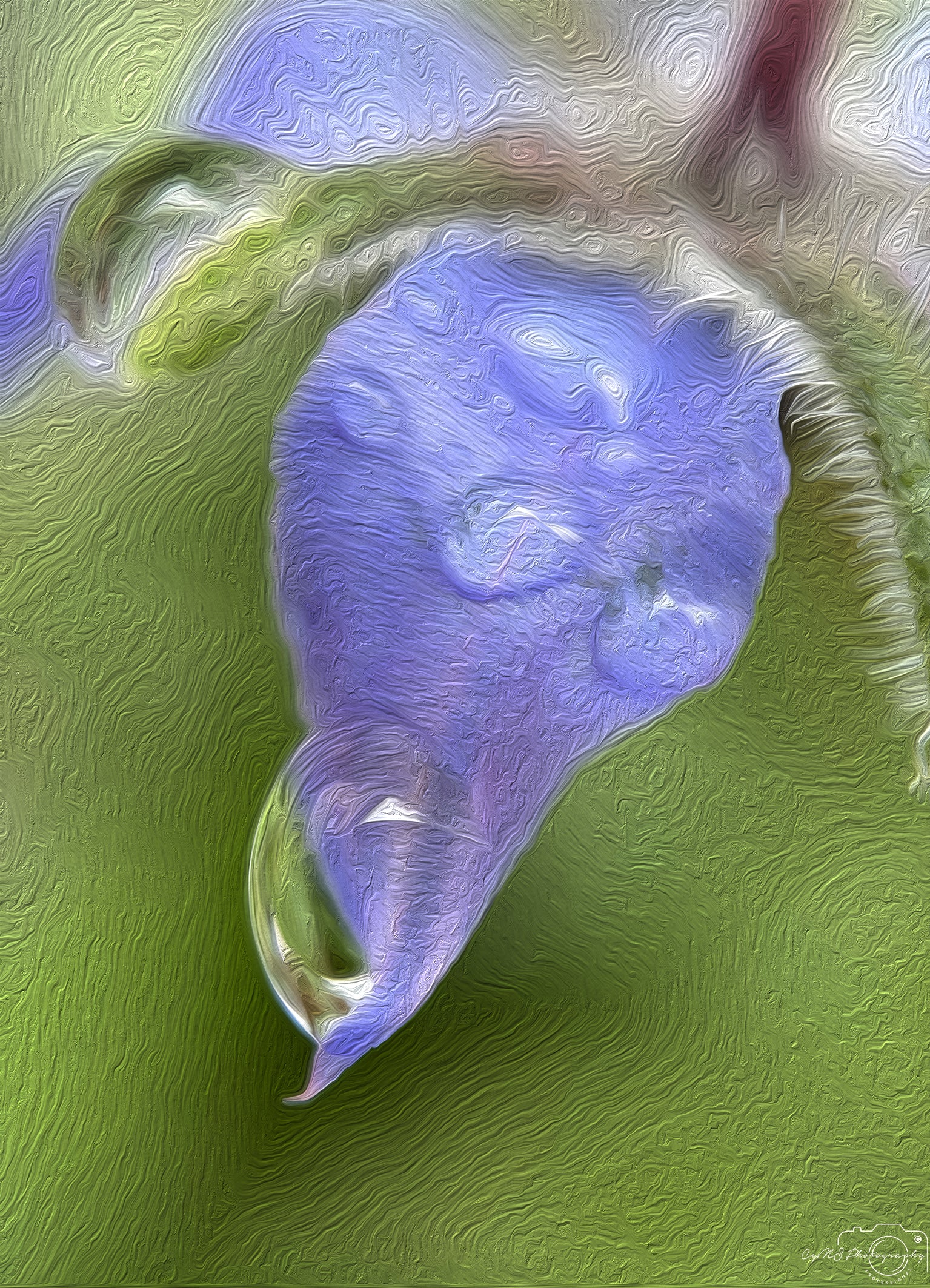 Upon the star-shaped bloom of a Borago officinalis, a beautiful water drop rests serenely, its smooth surface echoing the deep blue of the petals beneath it. Balanced in perfect stillness, it seems almost woven into the flower itself, like a jewel nature set there with quiet intent.