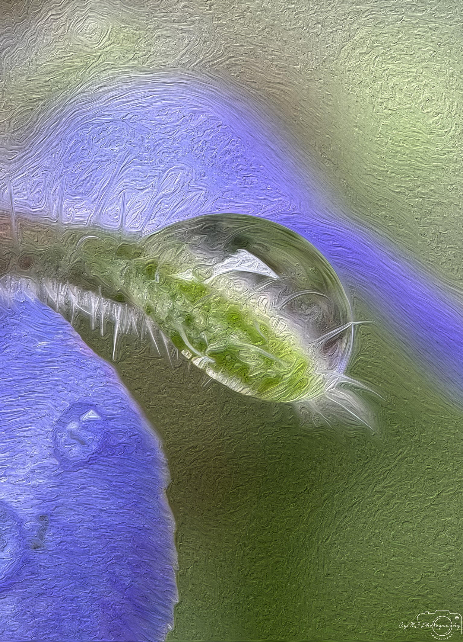 Upon the star-shaped bloom of a Borago officinalis, a beautiful water drop rests serenely, its smooth surface echoing the deep blue of the petals beneath it. Balanced in perfect stillness, it seems almost woven into the flower itself, like a jewel nature set there with quiet intent.