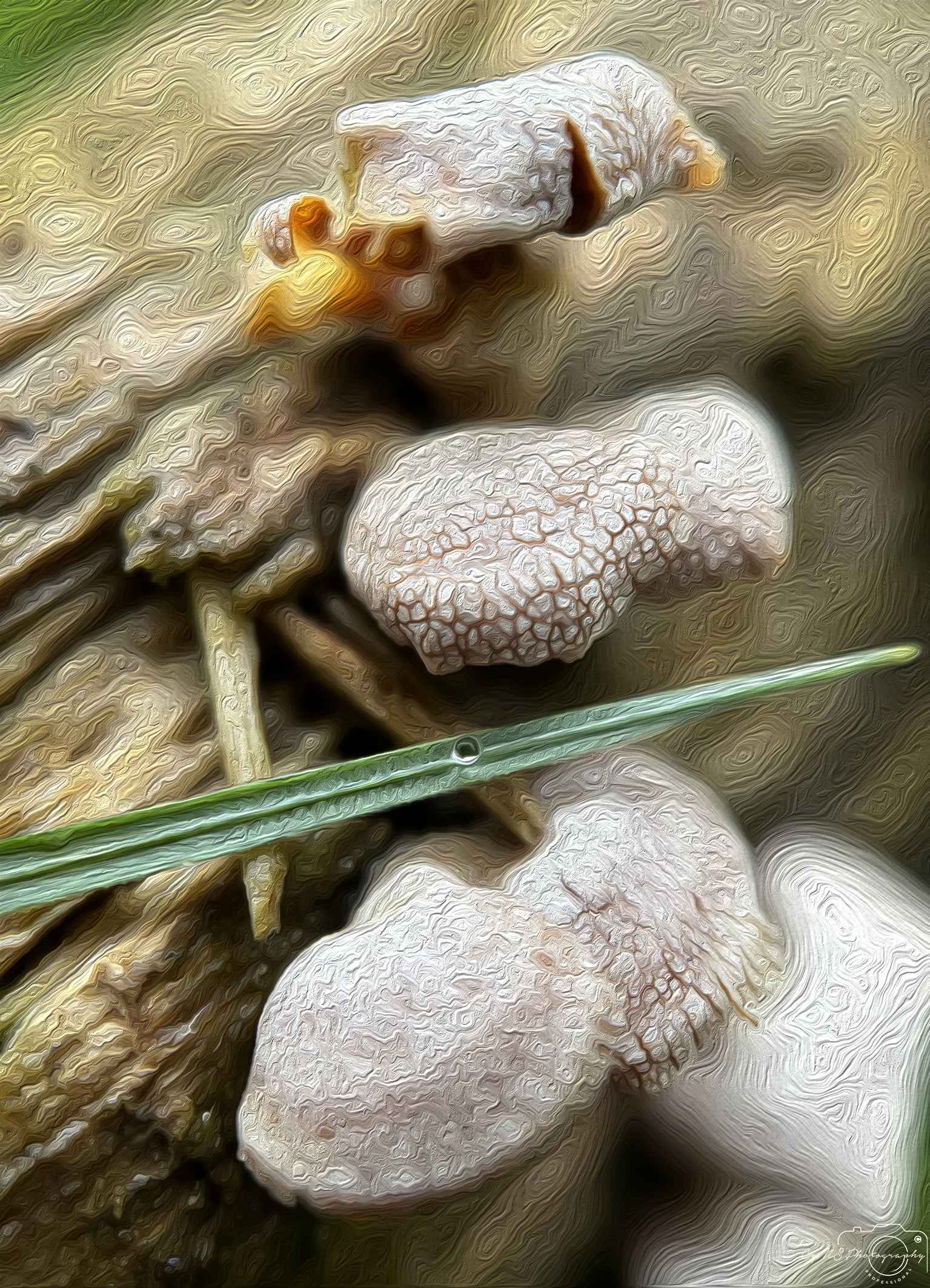 A crystal-clear water drop rests on the soft curve of a fallen leaf, settled gently atop a cluster of tiny mushrooms clinging to a slender branch. The mushrooms, small and firm, brace the leaf with quiet strength, their caps beaded with dew. In this still corner of the forest, everything is hushed, held in the calm of untouched simplicity.