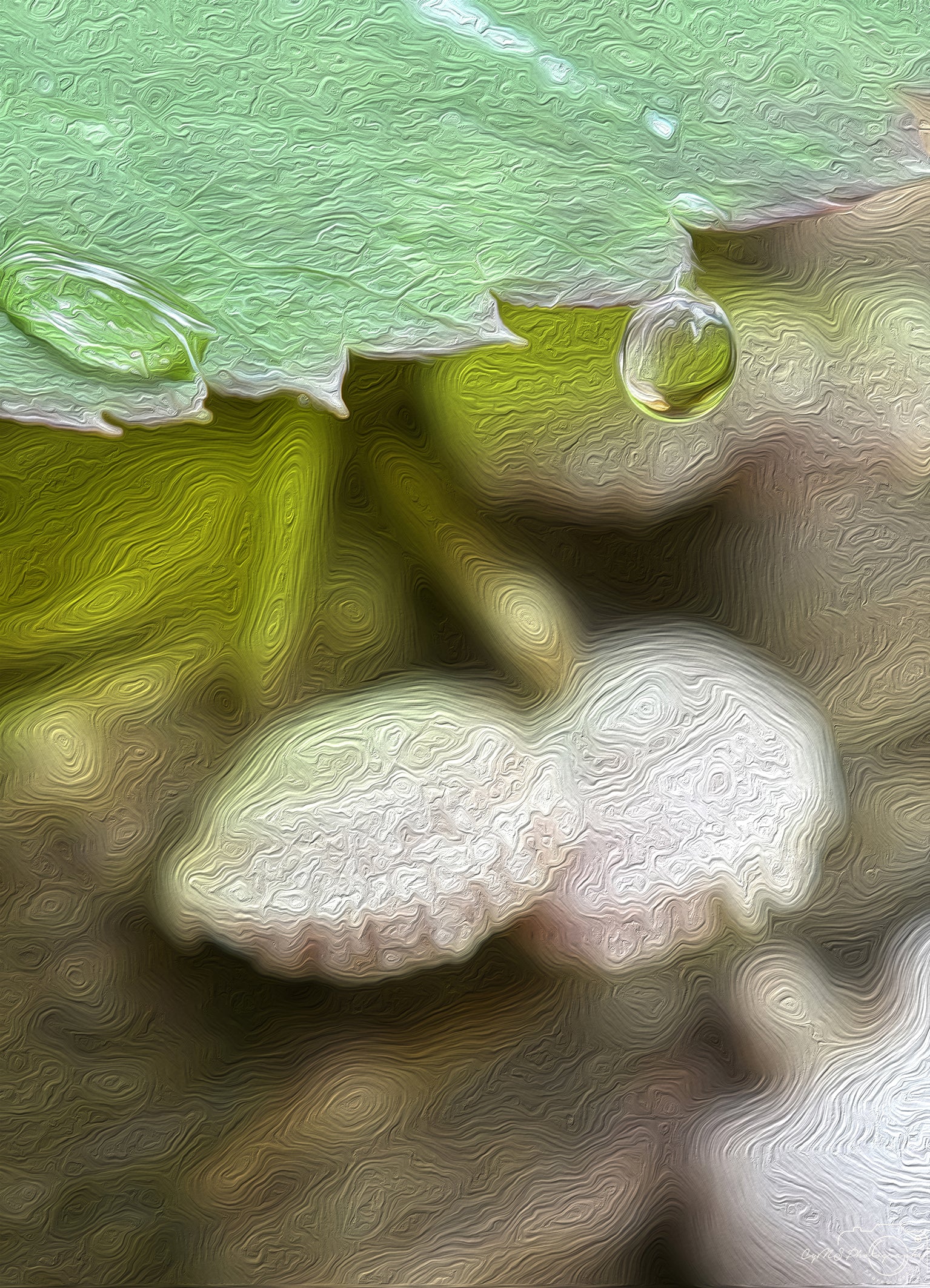 A crystal-clear water drop rests on the soft curve of a fallen leaf, settled gently atop a cluster of tiny mushrooms clinging to a slender branch. The mushrooms, small and firm, brace the leaf with quiet strength, their caps beaded with dew. In this still corner of the forest, everything is hushed, held in the calm of untouched simplicity.
