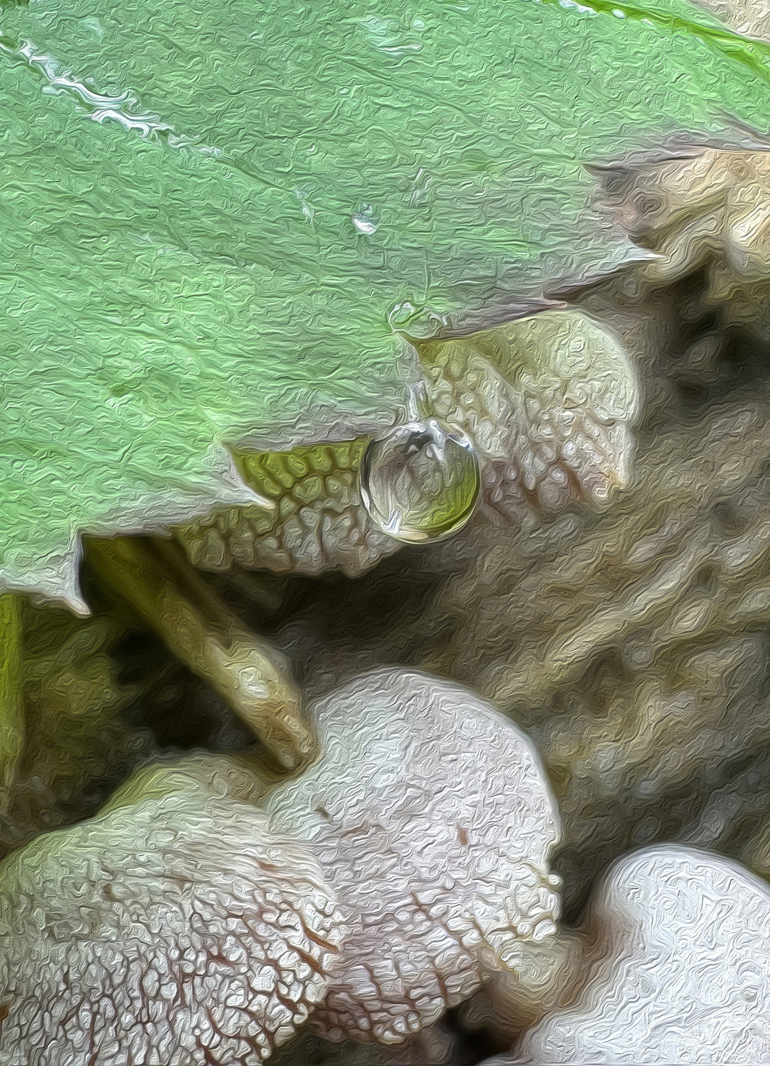 A crystal-clear water drop rests on the soft curve of a fallen leaf, settled gently atop a cluster of tiny mushrooms clinging to a slender branch. The mushrooms, small and firm, brace the leaf with quiet strength, their caps beaded with dew. In this still corner of the forest, everything is hushed, held in the calm of untouched simplicity.