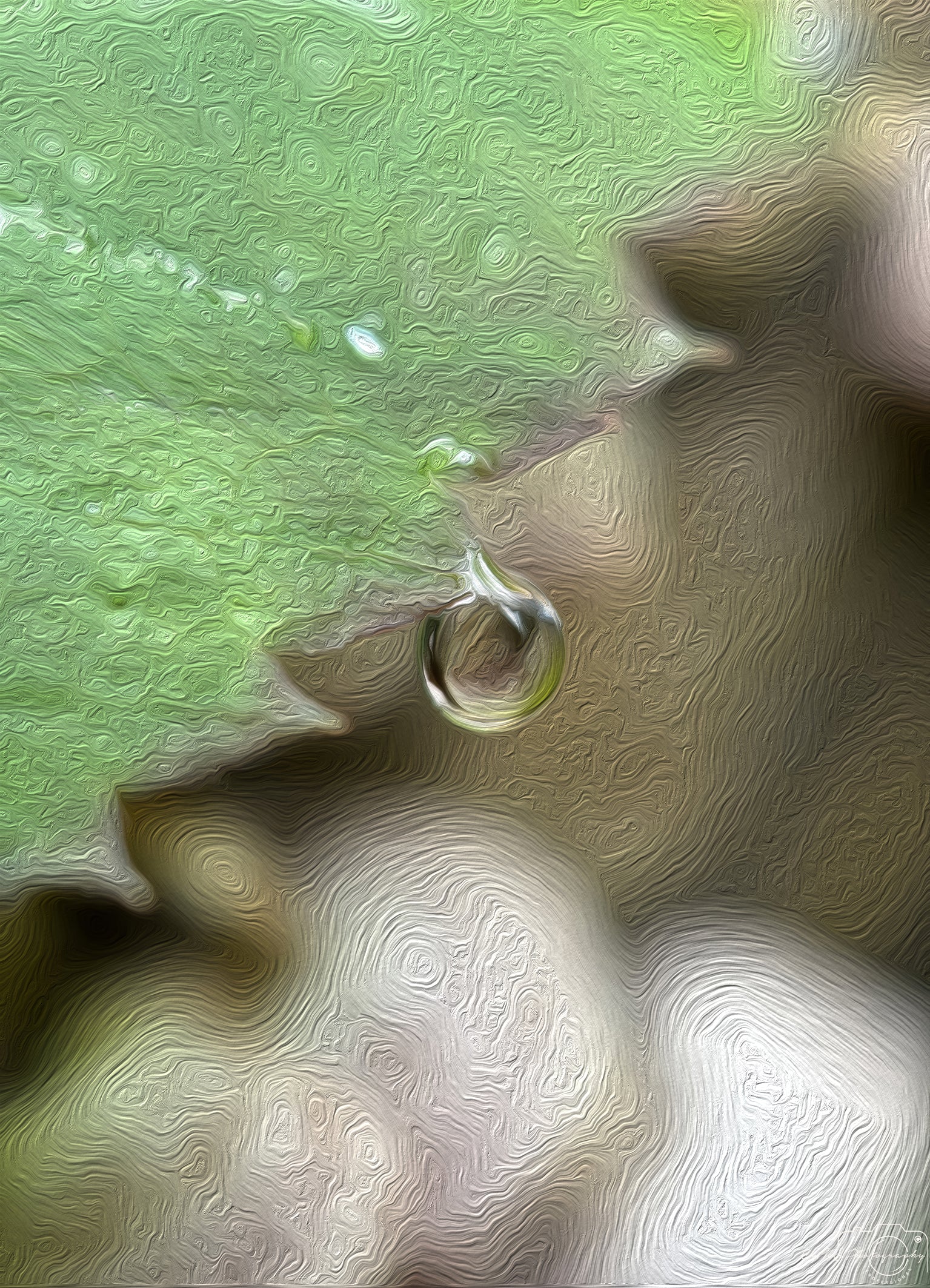 A crystal-clear water drop rests on the soft curve of a fallen leaf, settled gently atop a cluster of tiny mushrooms clinging to a slender branch. The mushrooms, small and firm, brace the leaf with quiet strength, their caps beaded with dew. In this still corner of the forest, everything is hushed, held in the calm of untouched simplicity.
