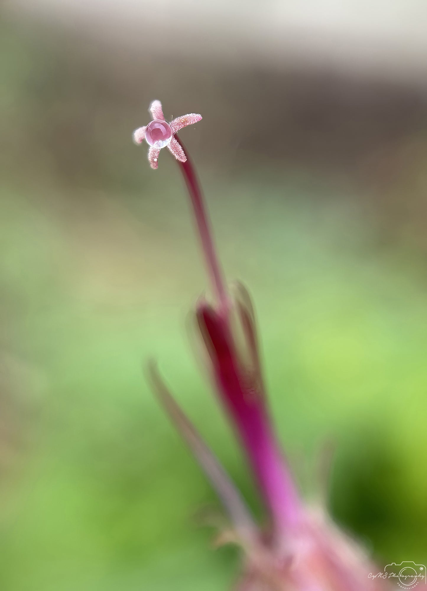 At the very tip of a long stem, right at the center of the Geranium macrorrhizum’s flower, rests a beautiful, crisp, and clear drop of water. The flower, with its soft blend of reddish, pink, and white petals, stands out vividly while everything else around it appears faded or blurred. This single droplet captures the light perfectly, like a delicate jewel cradled by nature. Only the flower and the water drop retain their full color and clarity, drawing the eye to this quiet yet striking moment.