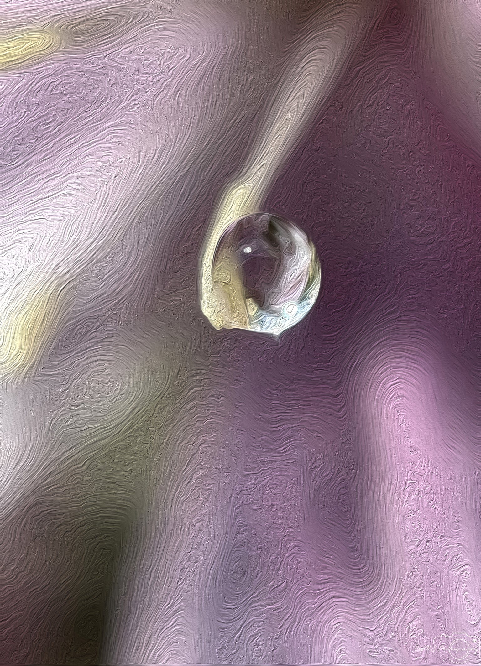 A perfectly rounded water droplet hangs delicately on the pistil of a Clematis montana, capturing a moment of pure stillness. The pale pink petals surround it softly, while the vibrant yellow pistils create a striking contrast that draws the eye. This gentle harmony of color and form makes the scene truly stunning. And at the center of it all, the glistening droplet mesmerizes—tiny, luminous, and utterly captivating.