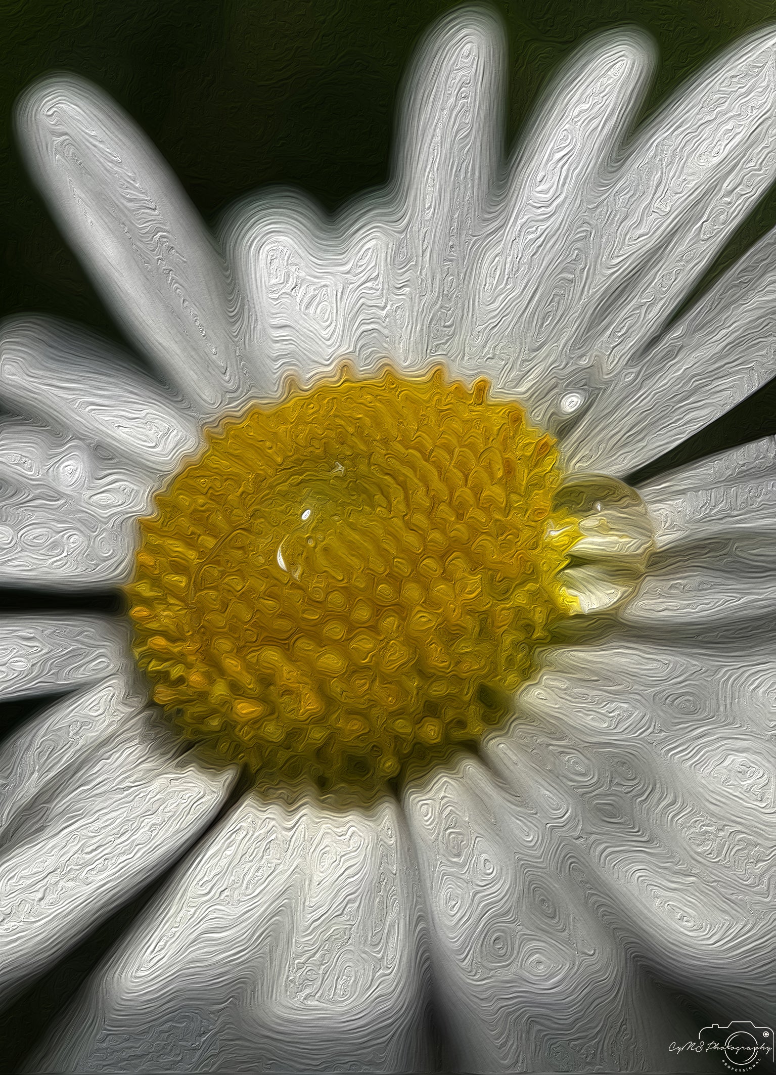 Near the bright yellow center of the same Leucanthemum vulgare, a beautiful and crystal-clear water droplet rests. It catches the light like glass, reflecting the surrounding greens with delicate precision. Nestled among the soft white petals, it adds a touch of quiet magic to the flower’s heart. This tiny sphere holds an entire scene within, a hidden world framed by nature’s gentle design.