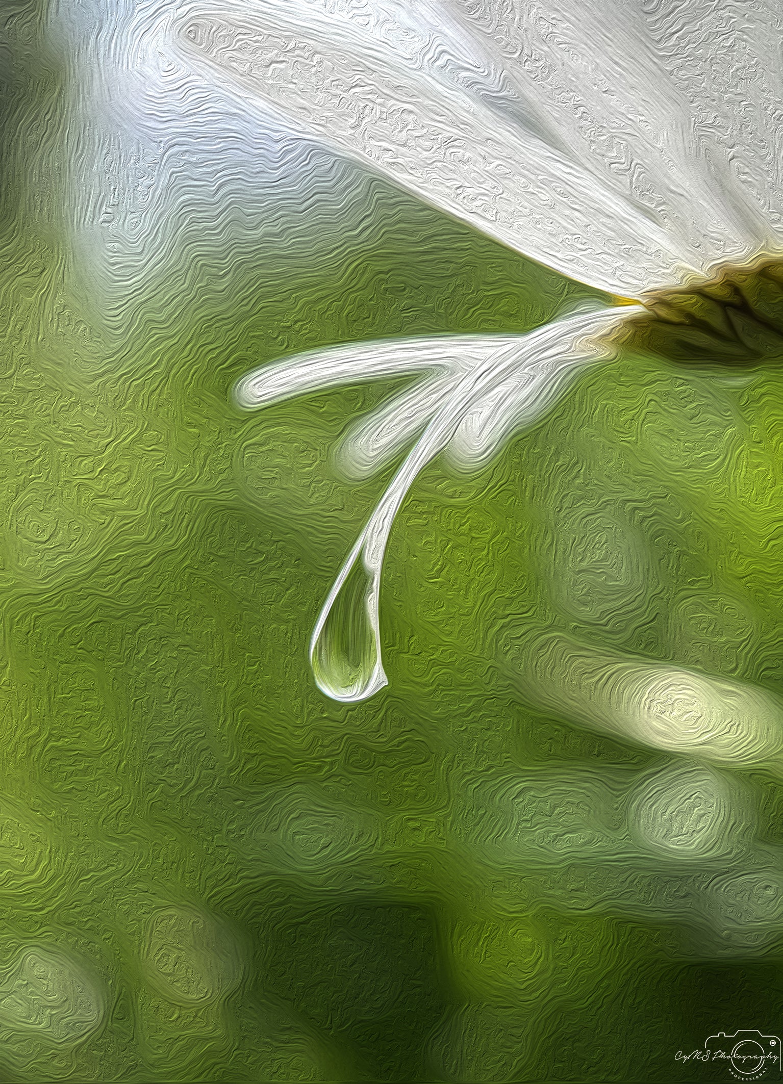 Between two radiant white petals of Leucanthemum vulgare, a crystal-clear droplet gently clings in perfect balance. Inside its curved surface, the reflection of slender green grass shimmers with breathtaking clarity and depth. The contrast between the flower’s snowy whiteness and the vivid emerald world within the droplet feels almost surreal. In this quiet moment, nature reveals its delicate artistry, crafting wonder from the simplest of details.