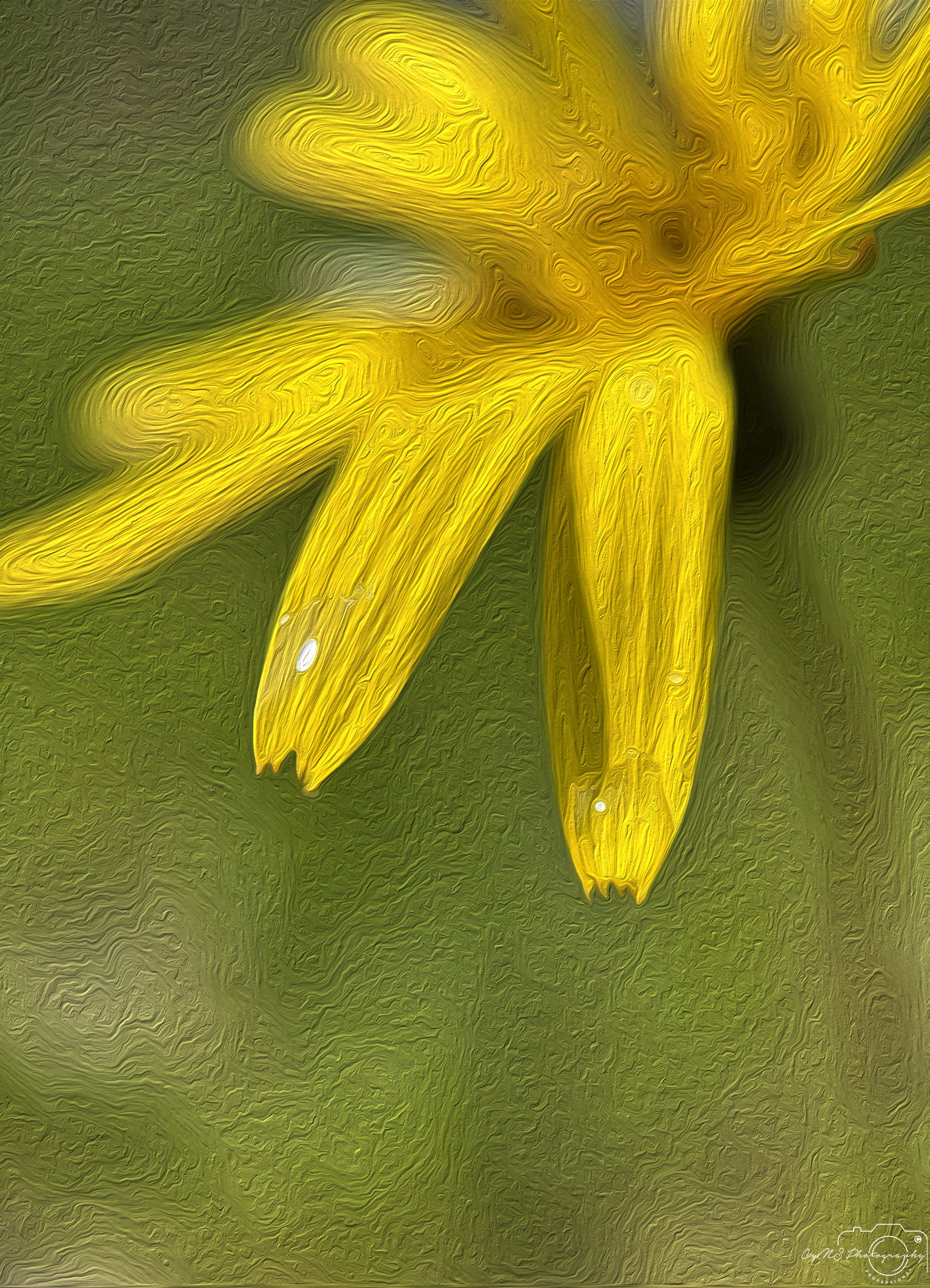 Two large water droplets cling to the tips of Tragopogon pratensis' vivid yellow petals, each one gleaming like a glass bead in the morning light. Resting delicately on opposite sides of the flower, the droplets magnify the fine texture of the petals beneath them, casting miniature reflections of the surrounding meadow. The petals, vibrant and spread like golden rays, seem to lift the droplets toward the sky, as if in silent offering. Together, flower and dew form a fleeting sculpture of light and color—a quiet testament to nature’s precision and grace.