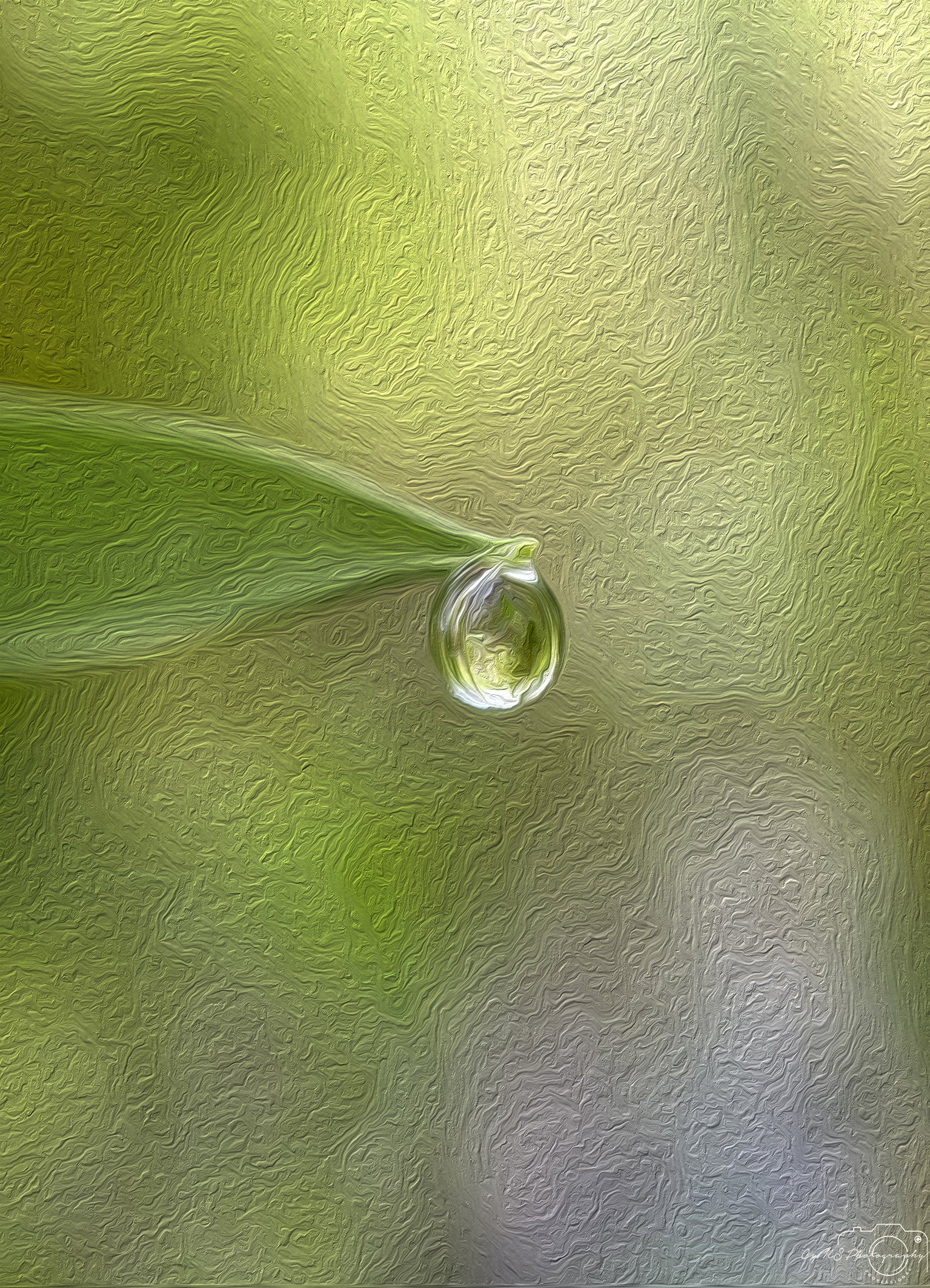 A single dew drop balances on a slender blade of grass, its presence delicate yet striking. The vivid green of the surrounding foliage sets the perfect stage, making the droplet gleam like a tiny lens of light—a quiet marvel in the heart of morning stillness.