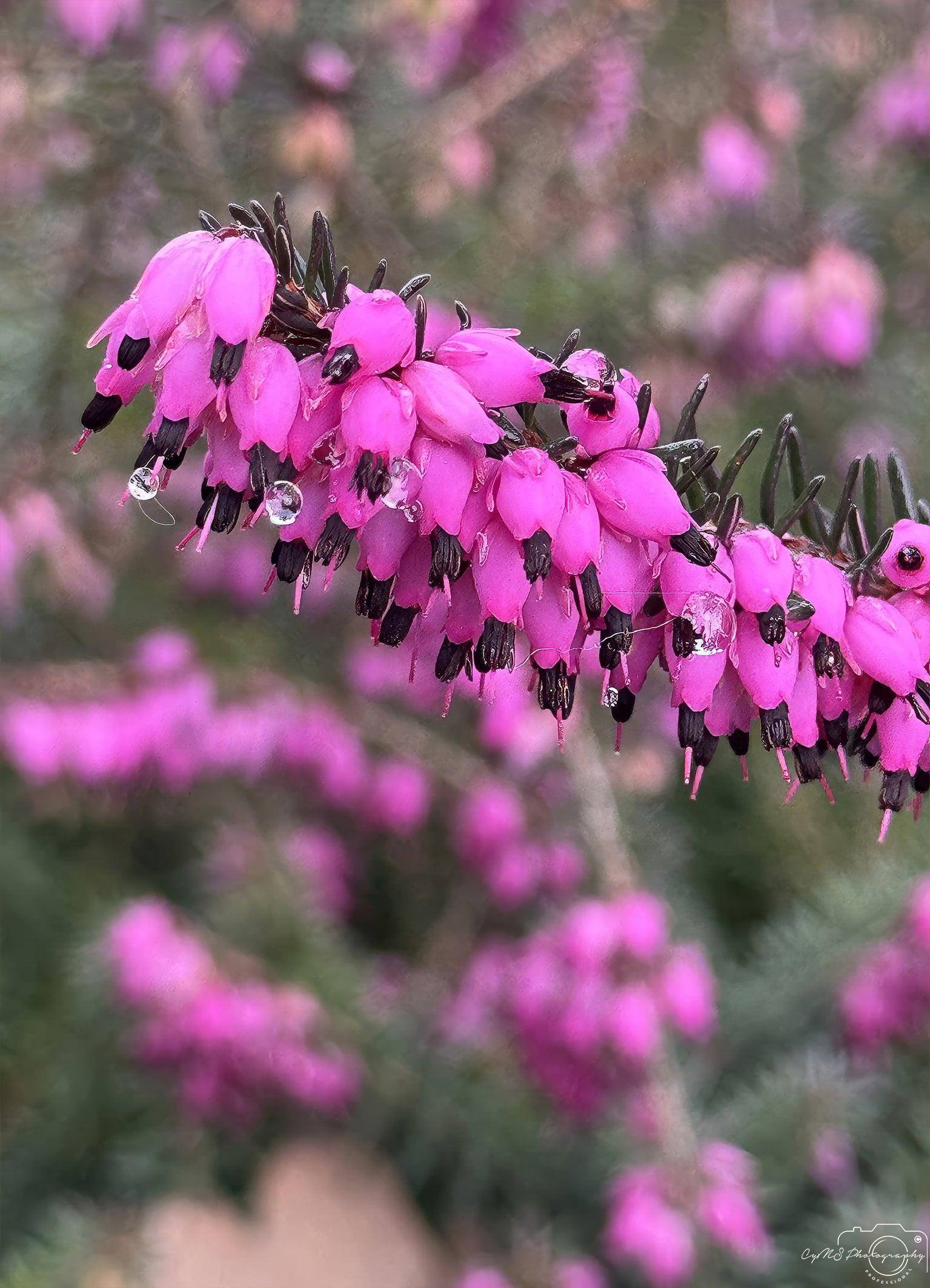 In this tranquil scene, a cluster of Erica carnea, or Winter Heath, captivates with its vivid pink color. The flowers are not traditional petals but rather tiny cylindrical capsules, each tipped with a small black dot. These unique blooms, delicate yet striking, form a beautiful contrast against the surrounding greenery. Some tiny water droplets are visible on the flowers, adding a fresh, dewy glow to the scene. The overall atmosphere is serene and calm, with the gentle pink hue of the Erica carnea offering a peaceful and vibrant presence in the landscape.