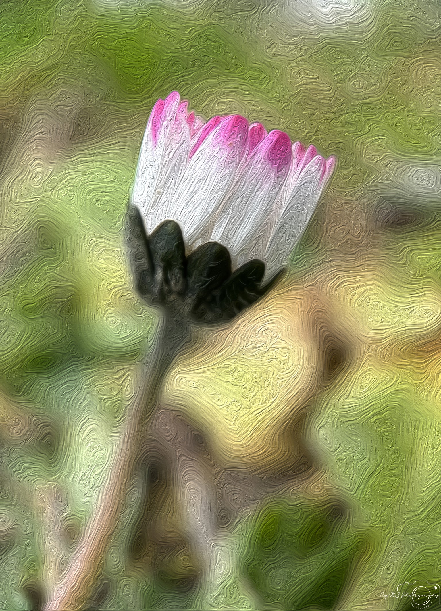 A Bellis perennis stands in quiet beauty, its soft white petals gently tinged with pinkish tips, creating a delicate gradient of color. From the side, the flower exudes a peaceful simplicity, its understated hues glowing softly in the light. The calm, serene atmosphere it creates feels like a gentle pause in time, evoking a sense of tranquility in nature. This unassuming bloom holds a quiet elegance, offering a peaceful escape from the everyday.