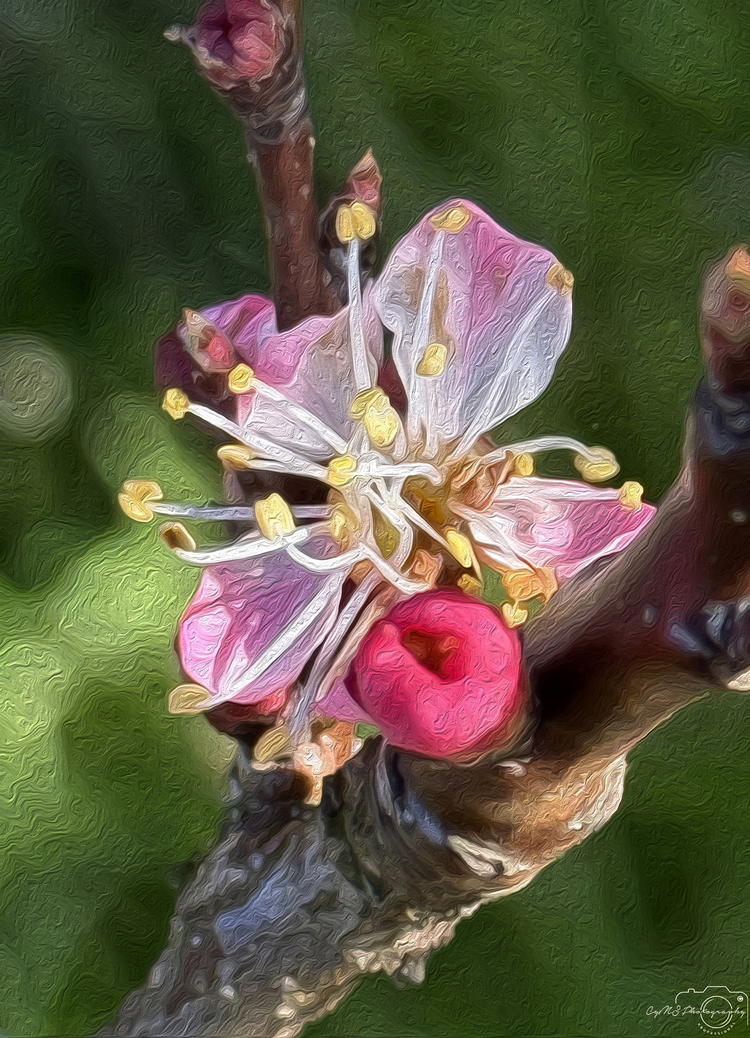A nice shot of a Prunus armeniaca flower reveals its stunning petals in delicate shades of white, red, and pink. The outer petals are soft white, gradually blending into a deeper pink toward the center, creating a beautiful gradient of color. The rich red at the heart of the flower highlights the vibrant stamens, adding a striking contrast to the gentle hues of the petals. The flower’s intricate details, from the fine veins on the petals to the delicate pistil, capture the essence of spring's delicate beauty. The overall composition radiates a sense of freshness and vitality.