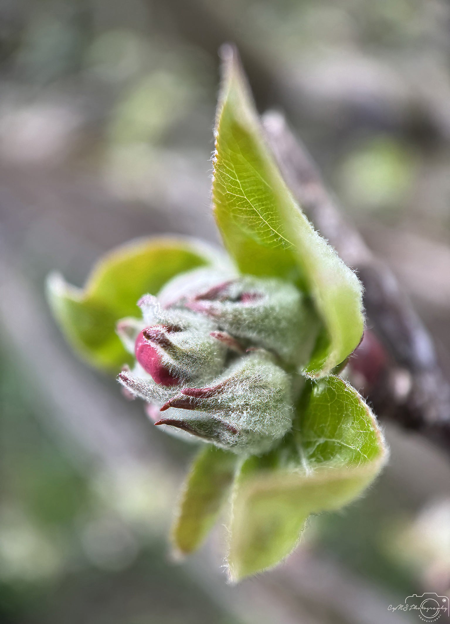 The Malus sylvestris flower is on the verge of blooming, with its vivid red buds standing out brightly. Surrounded by lush green leaves, which seem to protect the delicate flower, the scene captures the anticipation of a beautiful bloom soon to unfold. The contrast between the vibrant red and the fresh green creates a striking and harmonious image, embodying the promise of the flower’s full beauty.
