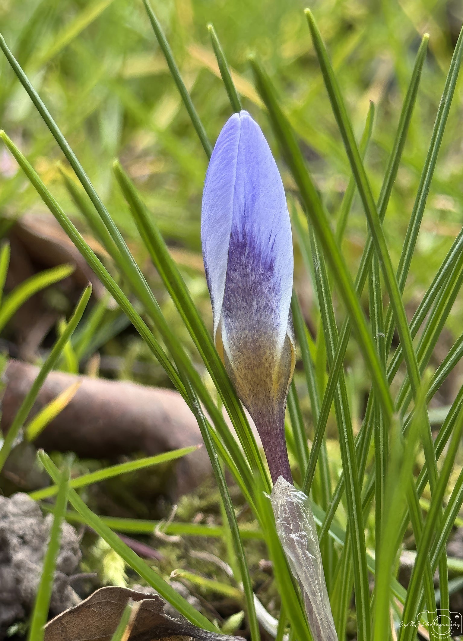 In this amazing shot of Crocus chrysanthus, the most striking feature is that the flower has shed its protective shield, clearly visible at its base. This reveals an intriguing comparison to the way a snake sheds its skin. The flower itself boasts a beautiful metallic purple-blue color, shimmering with depth and richness. It stands exposed, with its vibrant hues contrasting beautifully against the fresh greenery around it, as if it’s been liberated from its protective layer, ready to bloom fully.
