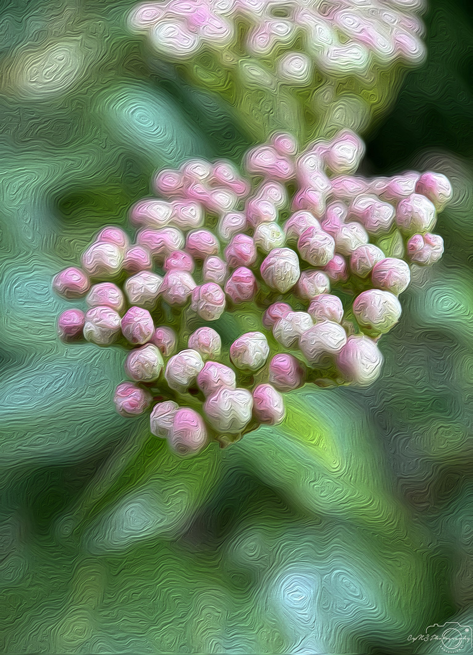 A beautiful picture of Viburnum tinus captures the buds still closed, yet hinting at the magnificent colors soon to bloom. Soft shades of light pink and cream-like white are subtly visible, promising a stunning display ahead. The vibrant green leaves in the background provide a perfect contrast, enhancing the anticipation of the flower’s full bloom. The combination of these delicate hues and the fresh greenery creates a serene and captivating scene.