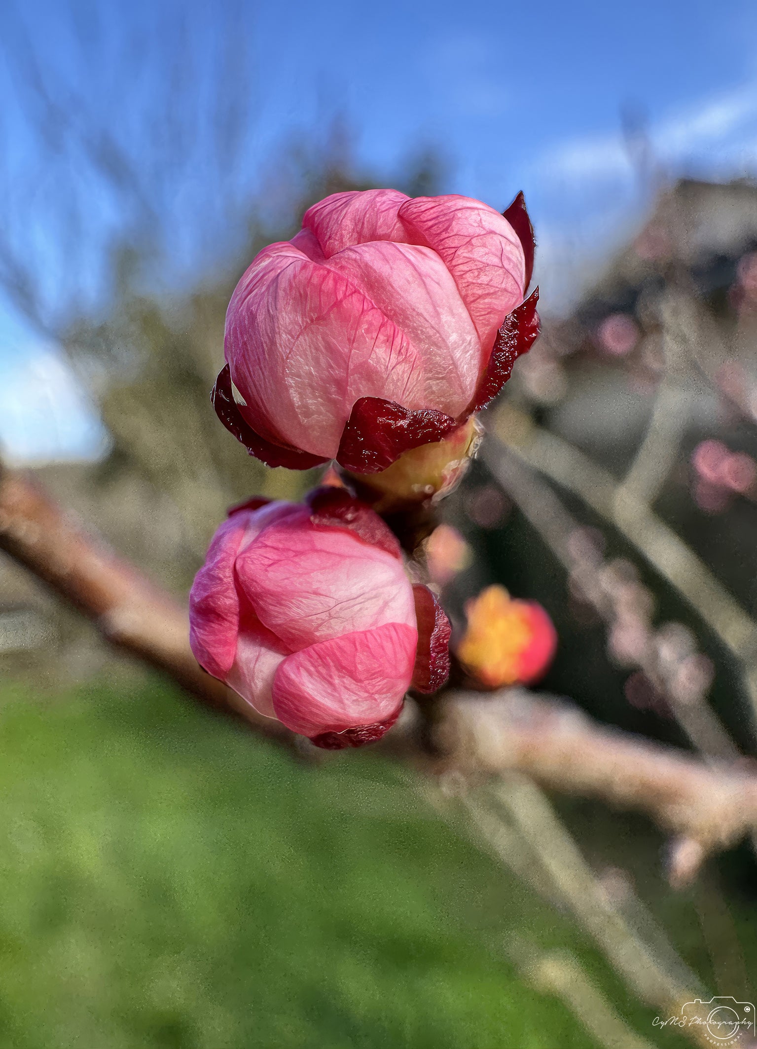 Some Prunus armeniaca buds are visible, their delicate rose-colored petals still closed, just beginning to reveal their beauty. The soft pink exterior contrasts beautifully with the vibrant yellow interior that peeks through as the buds prepare to open. The combination of these warm colors adds a sense of vibrancy and anticipation, hinting at the full bloom that is soon to come. The gentle curves and promising hues make the buds a captivating sight, full of natural elegance.