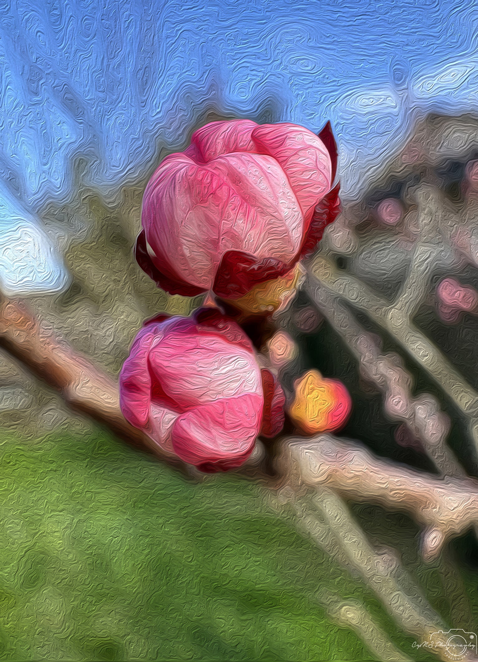 Some Prunus armeniaca buds are visible, their delicate rose-colored petals still closed, just beginning to reveal their beauty. The soft pink exterior contrasts beautifully with the vibrant yellow interior that peeks through as the buds prepare to open. The combination of these warm colors adds a sense of vibrancy and anticipation, hinting at the full bloom that is soon to come. The gentle curves and promising hues make the buds a captivating sight, full of natural elegance.